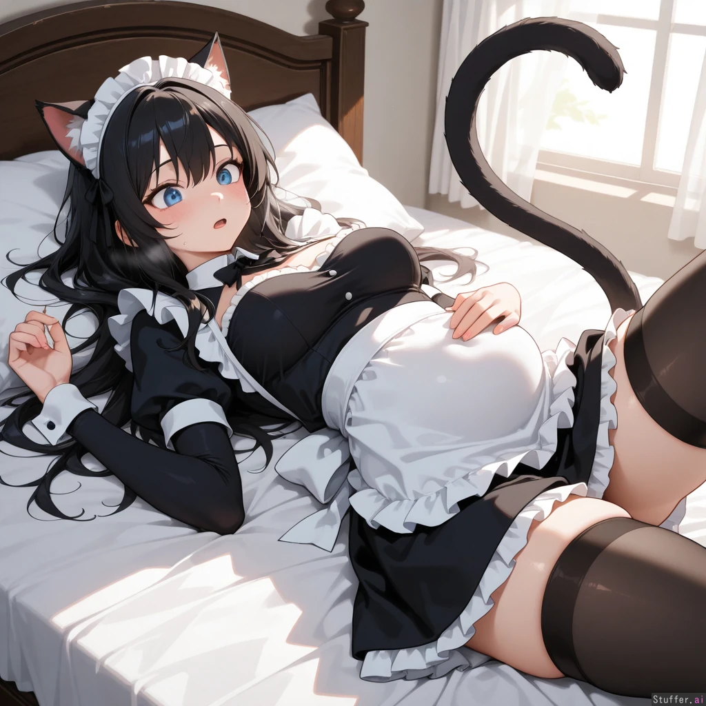 8k quality, perfect anatomy, detailed background, beautiful face and eyes, detailed face, bedroom , cat girl, cat ears, cat_tail, black long hair over shoulders, thick thighs, medium breasts, light blue eyes, adult, long arms, maid uniform, maid skirt, maid, Laying in bed, laying on bed, just woken up, shocked, scaried looking at self, holding belly, hard breathing Viewed from_front