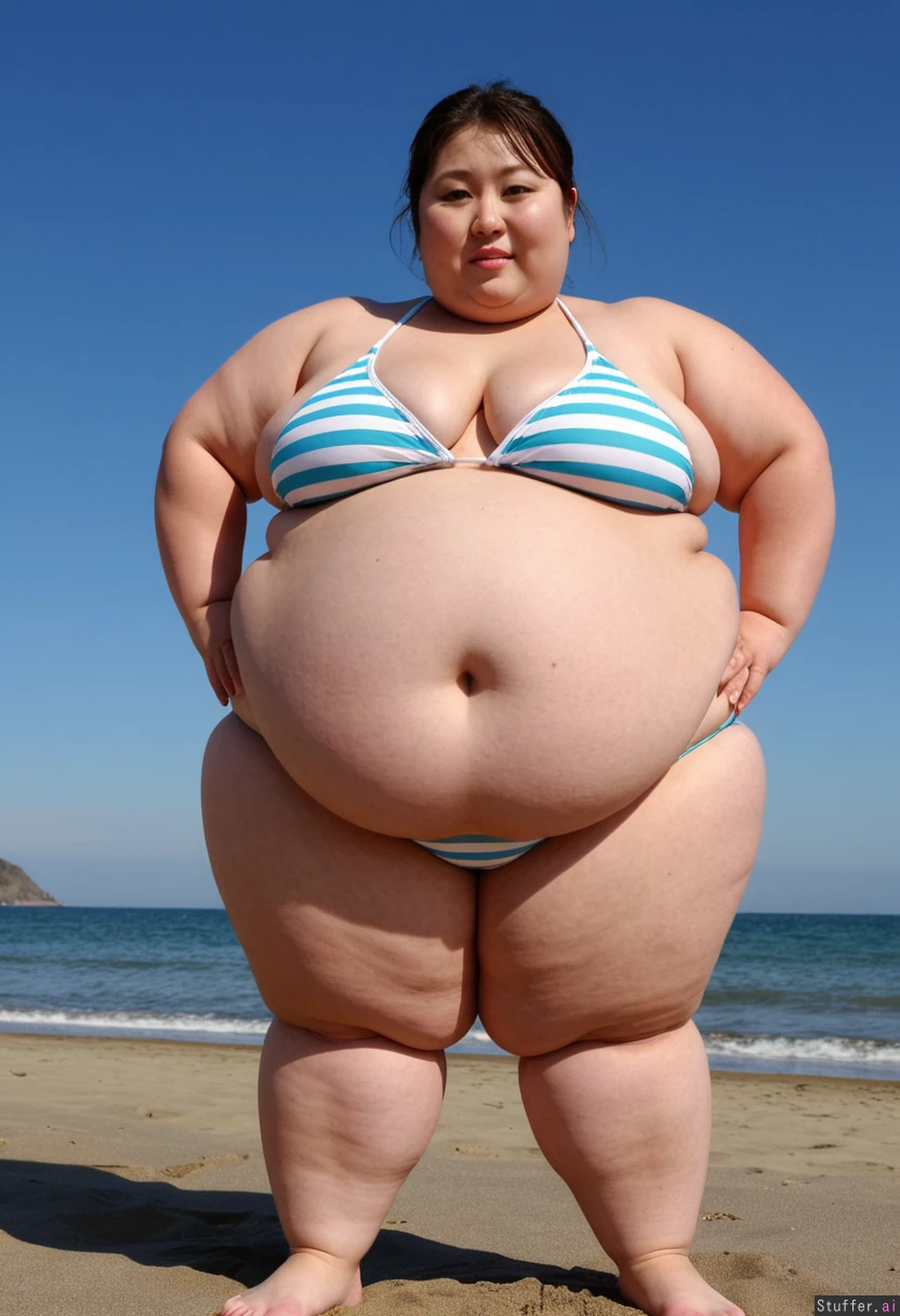 cute obese japanese girl, bikini, beach, muscular arms, huge belly, fat legs