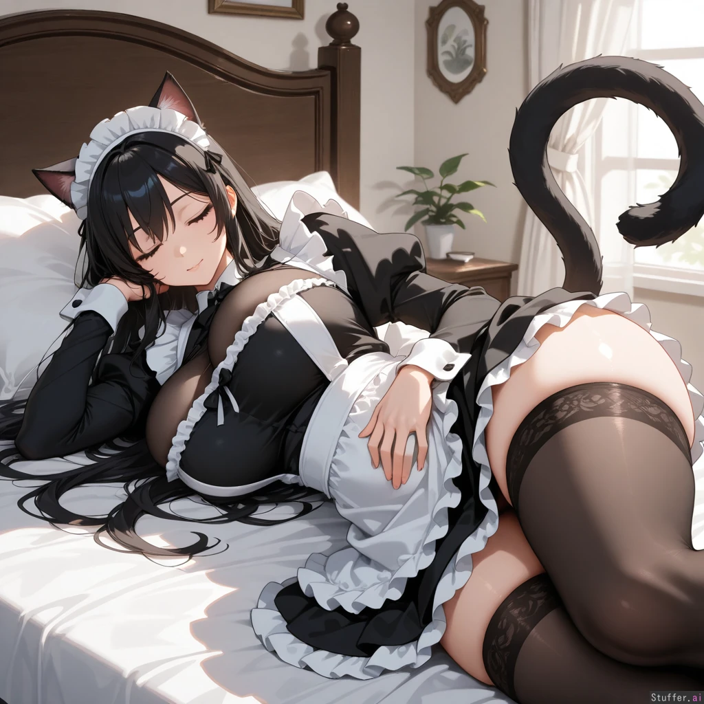 8k quality, perfect anatomy, detailed background, beautiful face and eyes, detailed face, bedroom , cat girl, cat ears, cat_tail, black long hair over shoulders, thick thighs, big breasts, light blue eyes, adult, long arms, maid uniform, maid skirt, Laying in bed, laying on side, sleeping, hand under head, closed eyes, happy, hand on belly Viewed from_front