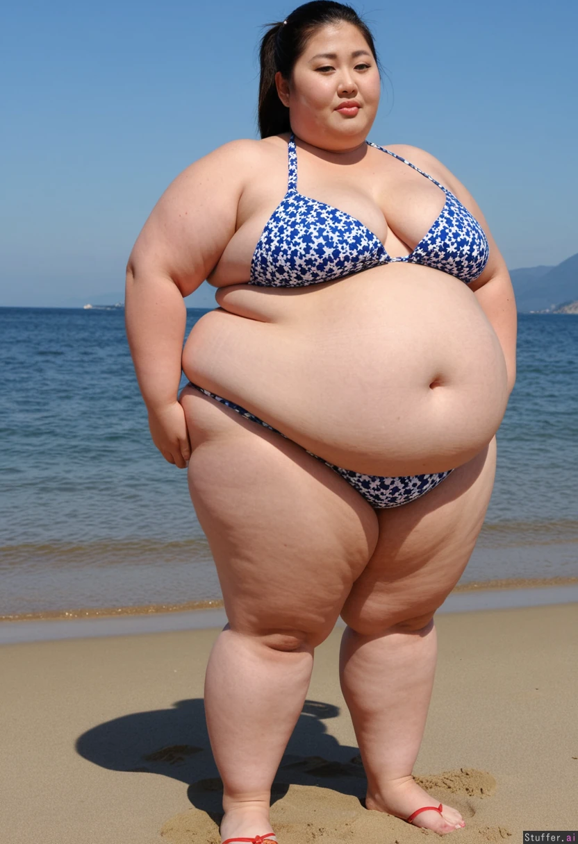 cute obese japanese girl, bikini, beach, muscular arms, huge belly, fat legs, fat shoulders, belly rolls, size comparison, skinny girl, superfat vs. skinny