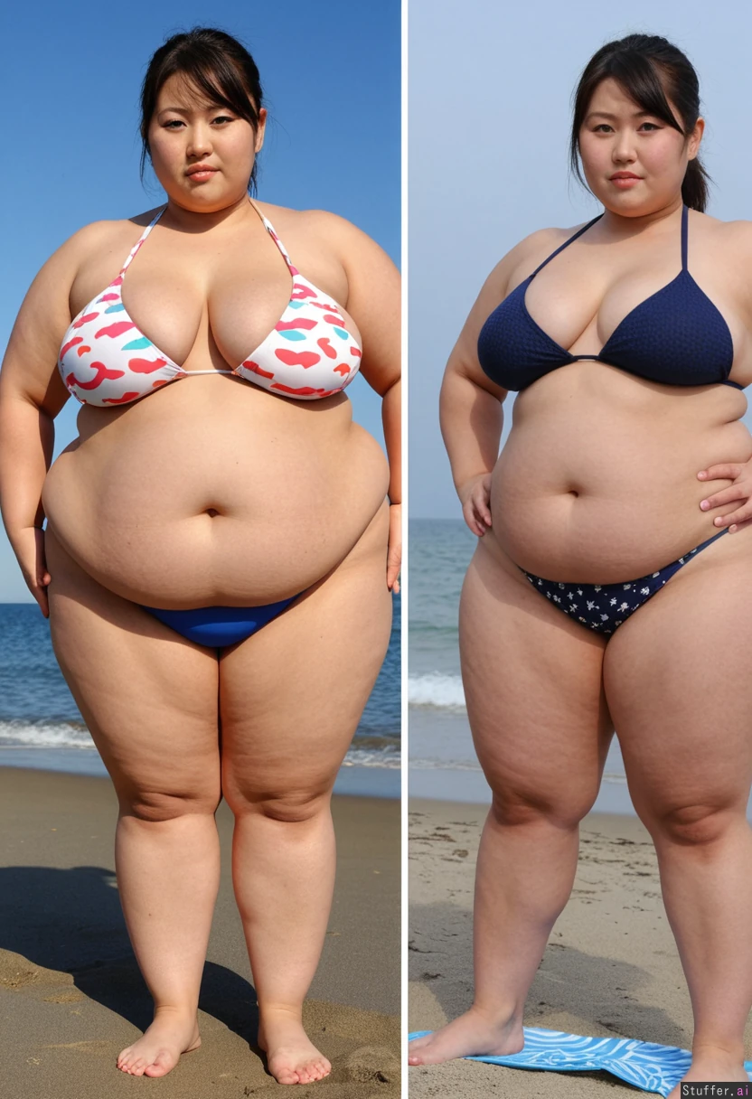 cute obese japanese girl, bikini, beach, muscular arms, huge belly, fat legs, fat shoulders, belly rolls, size comparison, skinny girl, superfat vs. skinny, realistic, detailed