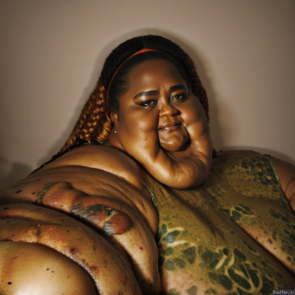 masterpiece, best quality, score_7. Photo realistic, ultra high quality, african ssbbw, beautiful face:1.4, (ultra double chin:1.9), (ultra fat face:1.9), ultra huge legs:1.9), (ultra huge arms:1.9), black braided hair:1.4