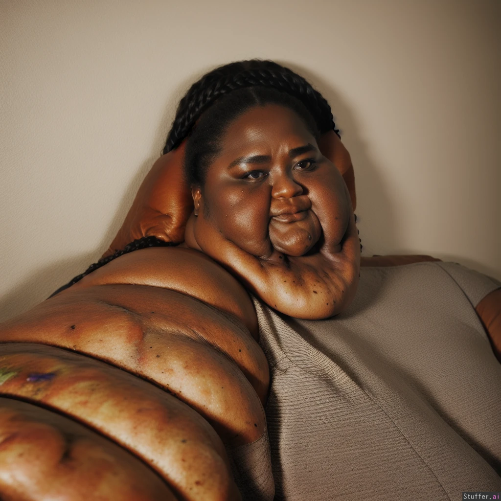 masterpiece, best quality, score_7. Photo realistic, ultra high quality, african ssbbw, beautiful face:1.4, (ultra double chin:1.9), (ultra fat face:1.9), ultra huge legs:1.9), (ultra huge arms:1.9), black braided hair:1.4