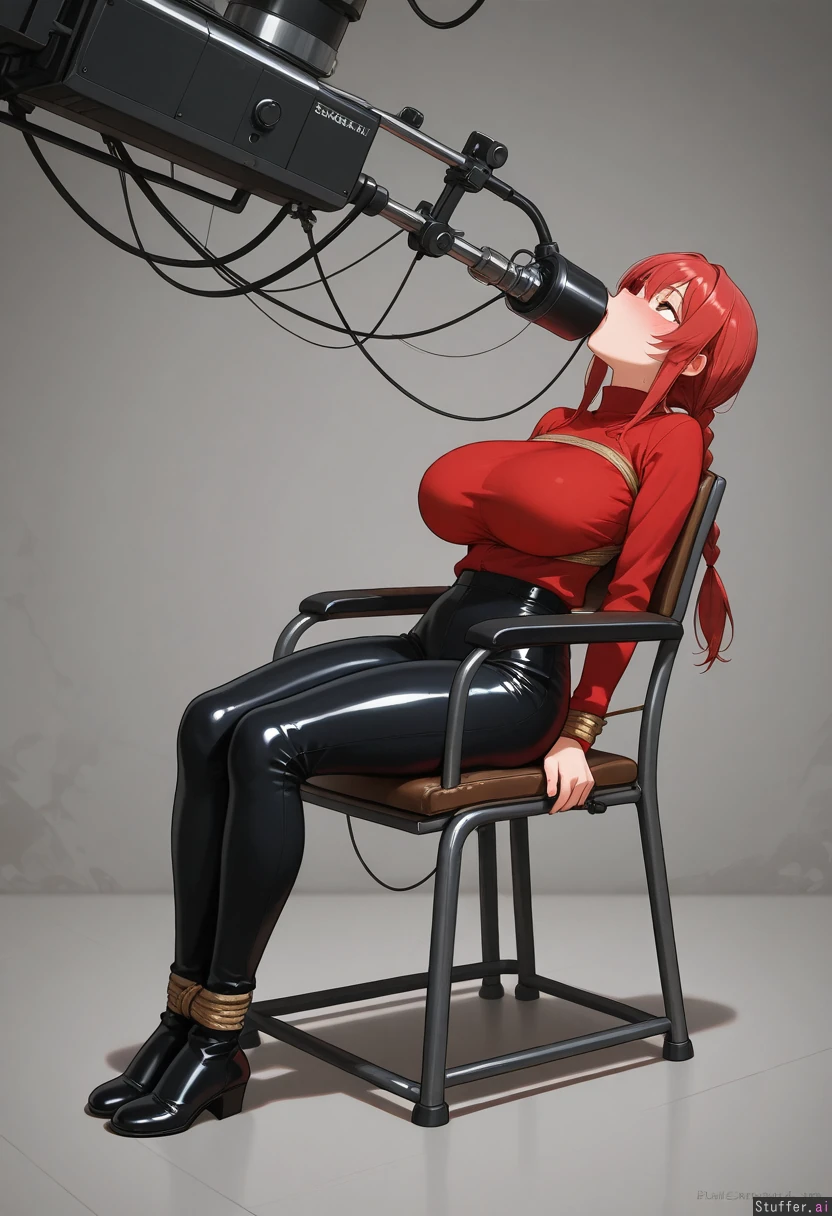 Solo, best_quality, best_proportion, full_body, Sitting in chair, tied to a chair, leaning back, looking up, feeding machine, force feeding, chewing, Blushing, aroused, embarresed Makima, tight_clothing, (morbidly_obese:0.2), (huge_belly:0.2), (huge_breasts:0.8), (huge_thighs:0.2)