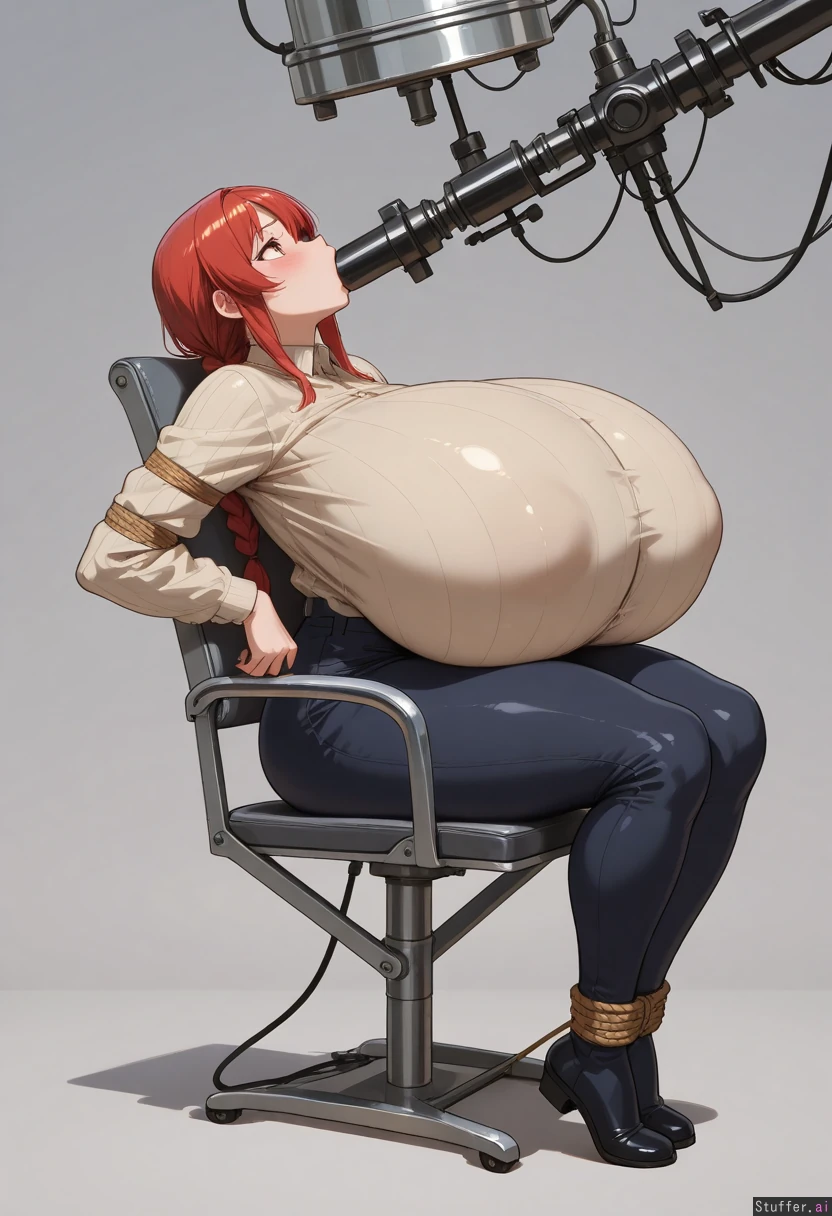 Solo, best_quality, best_proportion, full_body, Sitting in chair, tied to a chair, leaning back, looking up, feeding machine, force feeding, chewing, Blushing, aroused, embarresed Makima, tight_clothing, (morbidly_obese:0.2), (huge_belly:0.2), (huge_breasts:1.6), (huge_thighs:0.2)