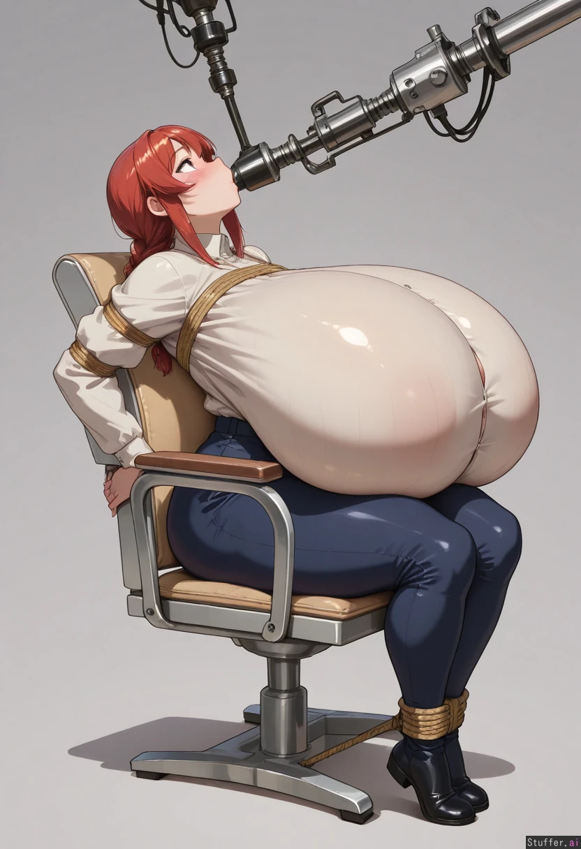 Solo, best_quality, best_proportion, full_body, Sitting in chair, tied to a chair, leaning back, looking up, feeding machine, force feeding, chewing, Blushing, aroused, embarresed Makima, tight_clothing, (morbidly_obese:0.2), (huge_belly:0.2), (huge_breasts:1.7), (huge_thighs:0.2)