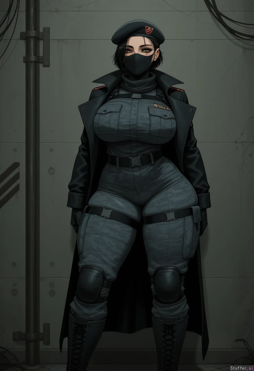 sophisticated detail, 4k, intricate detail, dark detail, dystopian, flawless, c.cu(artist), thevarking(artist), krekkov (artist), DevilHS(artist), rainy trench background, 1girl, solo, (short black hair), tall, ((brown eyecolor)), pale skin, (breast implants), thick thighs, flirty, seductive, black eyeshadow, black eyeliner, facial piercings, horny, thighs, athletic, combat_boots, black camo military jacket, black camo combat pants, black beret, black gloves, black mask, covered_mouth, thigh_expansion, muscular_legs, standing at attention, tight_clothes, black leather trench coat, muscular_female,
