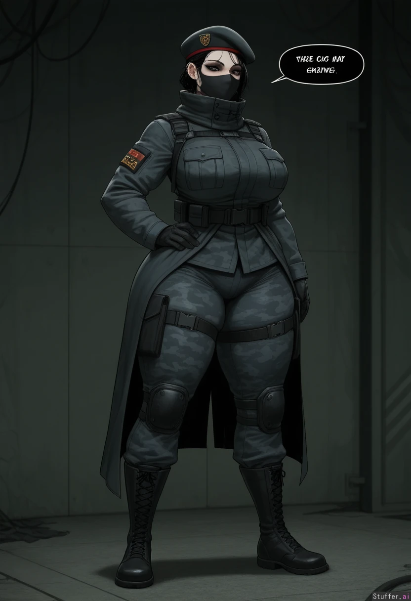 sophisticated detail, 4k, intricate detail, dark detail, dystopian, flawless, c.cu(artist), thevarking(artist), krekkov (artist), DevilHS(artist), rainy trench background, 1girl, solo, (short black hair), tall, ((brown eyecolor)), pale skin, (breast implants), thick thighs, flirty, seductive, black eyeshadow, black eyeliner, facial piercings, horny, thighs, athletic, combat_boots, black camo military jacket, black camo combat pants, black beret, black gloves, black mask, covered_mouth, thigh_expansion, muscular_legs, standing at attention, tight_clothes, black leather trench coat, muscular_female,