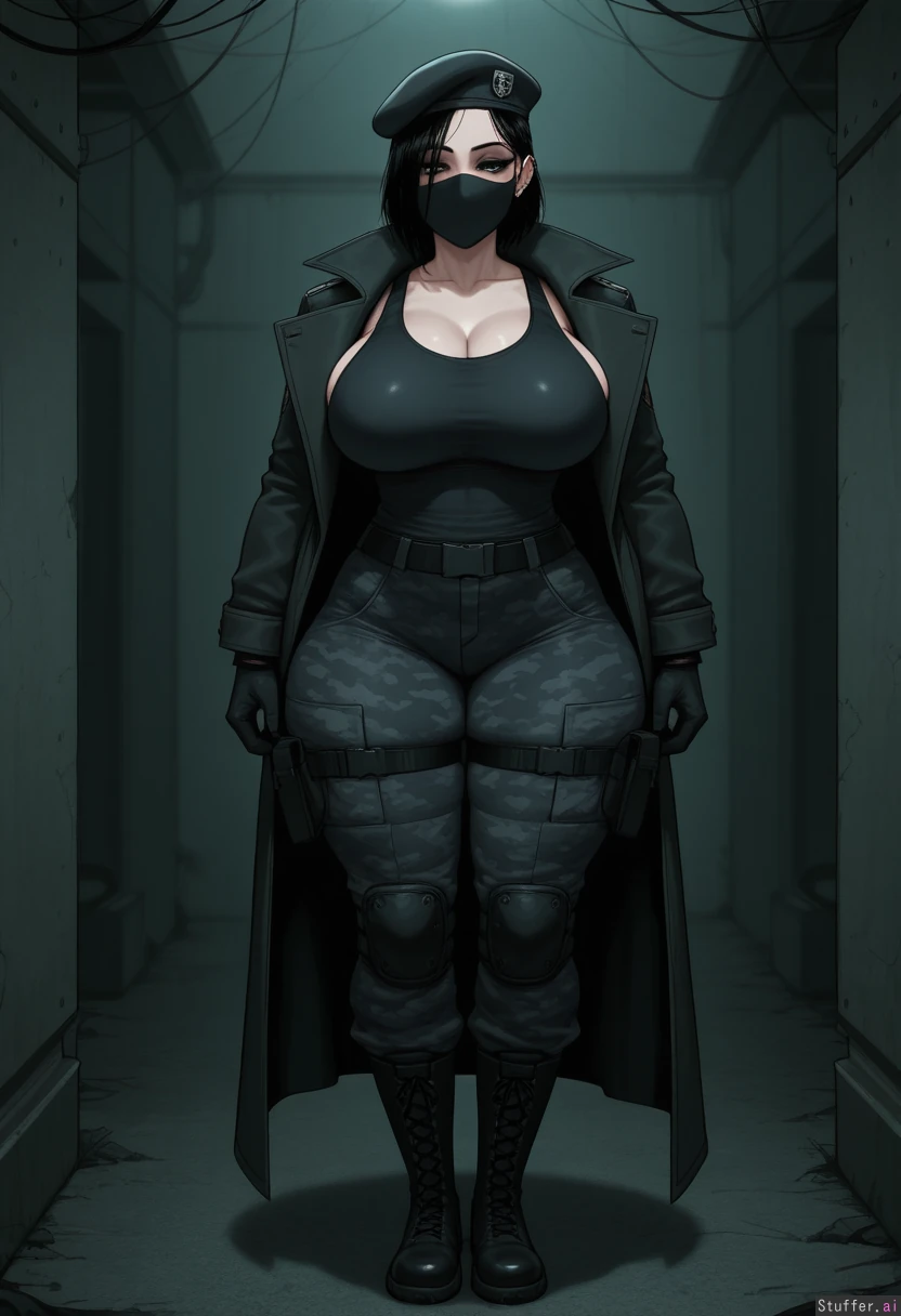 sophisticated detail, 4k, intricate detail, dark detail, dystopian, flawless, c.cu(artist), thevarking(artist), krekkov (artist), DevilHS(artist), rainy trench background, 1girl, solo, (short black hair), tall, ((brown eyecolor)), pale skin, (breast implants), thick thighs, flirty, seductive, black eyeshadow, black eyeliner, facial piercings, horny, thighs, athletic, combat_boots, black camo tank top, black camo combat pants, black beret, black gloves, black mask, covered_mouth, thigh_expansion, muscular_legs, standing at attention, tight_clothes, black leather trench coat, muscular_female,