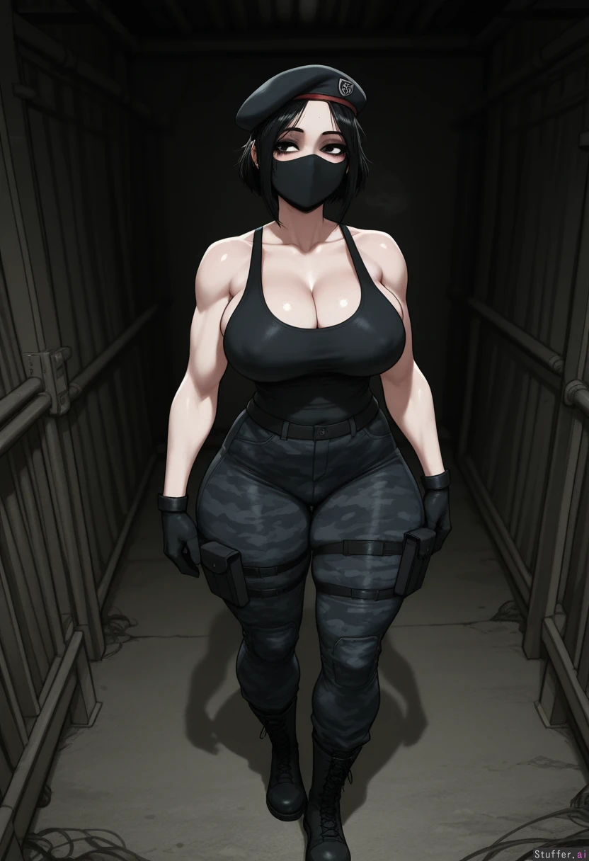 sophisticated detail, 4k, intricate detail, dark detail, dystopian, flawless, c.cu(artist), thevarking(artist), krekkov (artist), DevilHS(artist), barracks background, 1girl, solo, (short black hair), tall, ((brown eyecolor)), pale skin, (breast implants), thick thighs, flirty, seductive, black eyeshadow, black eyeliner, facial piercings, horny, thighs, athletic, combat_boots, black camo tank top, black camo combat pants, black beret, black gloves, black mask, covered_mouth, thigh_expansion, muscular_legs, standing at attention, tight_clothes, muscular_female, glossy skin,