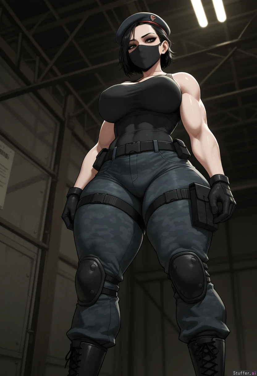 sophisticated detail, 4k, intricate detail, dark detail, dystopian, flawless, c.cu(artist), thevarking(artist), krekkov (artist), DevilHS(artist), barracks background, 1girl, solo, (short black hair), tall, ((brown eyecolor)), pale skin, (breast implants), thick thighs, flirty, seductive, black eyeshadow, black eyeliner, facial piercings, horny, thighs, athletic, combat_boots, black camo tank top, black camo combat pants, black beret, black gloves, black mask, covered_mouth, thigh_expansion, muscular_legs, standing at attention, tight_clothes, muscular_female, glossy skin, low-angle_view, leaning_on_belly,