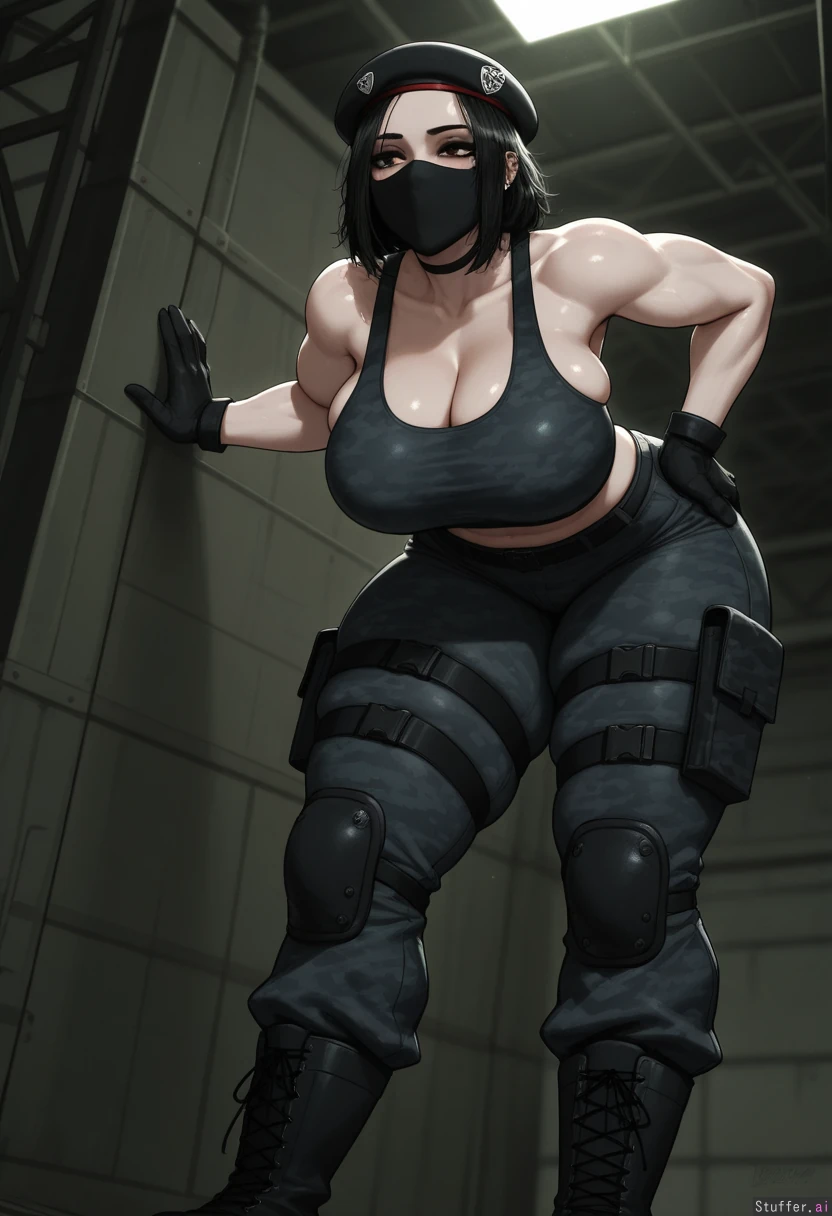 sophisticated detail, 4k, intricate detail, dark detail, dystopian, flawless, c.cu(artist), thevarking(artist), krekkov (artist), DevilHS(artist), barracks background, 1girl, solo, (short black hair), tall, ((brown eyecolor)), pale skin, (breast implants), thick thighs, flirty, seductive, black eyeshadow, black eyeliner, facial piercings, horny, thighs, athletic, combat_boots, black camo tank top, black camo combat pants, black beret, black gloves, black mask, covered_mouth, thigh_expansion, muscular_legs, standing at attention, tight_clothes, muscular_female, glossy skin, low-angle_view, leaning_forward,