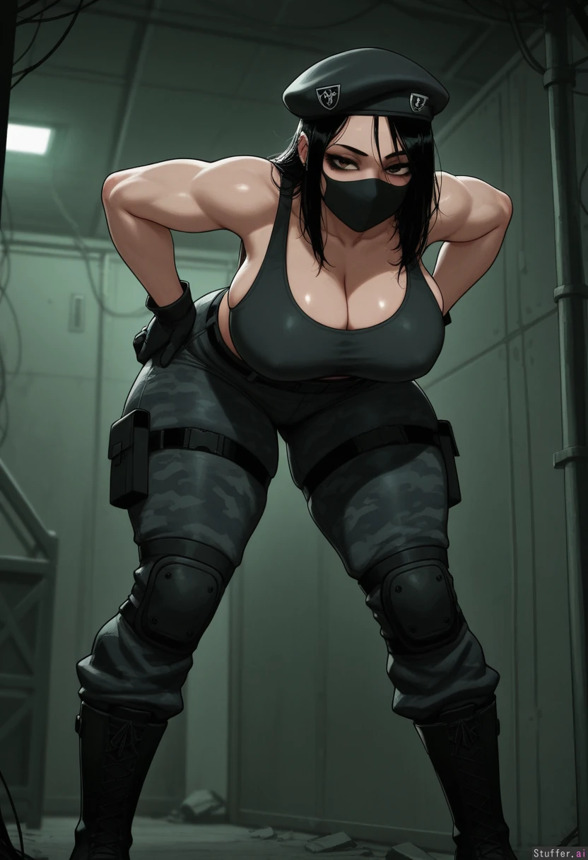 sophisticated detail, 4k, intricate detail, dark detail, dystopian, flawless, c.cu(artist), thevarking(artist), krekkov (artist), DevilHS(artist), barracks background, 1girl, solo, (short black hair), tall, ((brown eyecolor)), pale skin, (breast implants), thick thighs, flirty, seductive, black eyeshadow, black eyeliner, facial piercings, horny, thighs, athletic, combat_boots, black camo tank top, black camo combat pants, black beret, black gloves, black mask, covered_mouth, thigh_expansion, muscular_legs, standing at attention, tight_clothes, muscular_female, glossy skin, low-angle_view, leaning_forward,