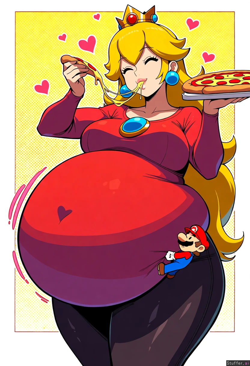 ((Detailed Background, at home)), (Masterpiece), ((Best_quality, intricate_detail)), perfect image, (heart), effect, motion lines, one on one, ((married couple)), ((1girl, Princess_Peach, female, chubby, bbw, massive flattering belly, huge fat round belly, potbelly, too full, eating pizza too much)), ((1boy, Mario, male, slim, rubs her belly from behind, happy, love each other))