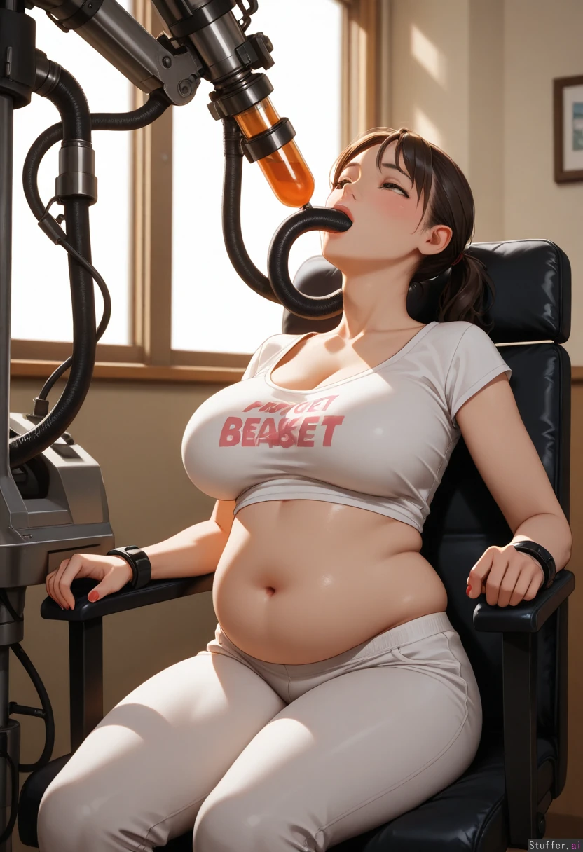 photorealistic 18 year old Asian girl, ( tube fed ), ((fully clothed)). ((bakery surrounded by colorful desserts and food, natural lighting)), embarrassed, ((vacant eyes, squinting, looking up)), ((restrained in comfortable chair, head tilted back))), ((belly ache)), ((feeding tube in mouth, drinking from tube, giant feeding machine)), Solo Asian, ponytail, brown eyes, red nails, deep cleavage, shallow navel, skintight t-shirt, belly hanging over panties, Thick, heavy breasts, (Chubby: 1.5), (Engorged breasts: 1.6), (Taut bloated belly: 1.0), (Bloated belly: 1.5), (Round hips: 1.5), (Wide_hips: 1.5), (Love handles: 1.5), (Thin arms: 1.5), beautiful shading, highly detailed, best quality, perfect anatomy, perfect proportions, perfect lighting, (best quality), (high rating), absurd res, high res, detailed, ultra quality, ((high quality)), masterpiece, (ultra high resolution), anime eyes, stunning beauty, detailed face, intricate detail, sophisticated detail, 1girl, exquisite detail, absurd resolution, correct anatomy, 8k, (highly detailed face), highly detailed skin texture,