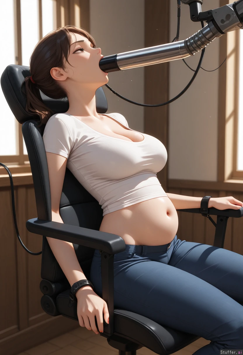 photorealistic 18 year old Asian girl, ( tube fed ), ((fully clothed)). ((bakery surrounded by colorful desserts and food, natural lighting)), embarrassed, ((vacant eyes, squinting, looking up)), ((restrained in comfortable chair, head tilted back))), ((belly ache)), ((feeding tube in mouth, drinking from tube, giant feeding machine)), Solo Asian, ponytail, brown eyes, red nails, deep cleavage, shallow navel, skintight t-shirt, belly hanging over panties, Thick, heavy breasts, (Stuffed: 1.5), (Engorged : 1.6), (Taut bloated belly: 1.0), (Bloated belly: 1.5), (Round hips: 1.5), (Narrow_hips: 1.5), (Love handles: 1.5), (Thin arms: 1.5), beautiful shading, highly detailed, best quality, perfect anatomy, perfect proportions, perfect lighting, (best quality), (high rating), absurd res, high res, detailed, ultra quality, ((high quality)), masterpiece, (ultra high resolution), anime eyes, stunning beauty, detailed face, intricate detail, sophisticated detail, 1girl, exquisite detail, absurd resolution, correct anatomy, 8k, (highly detailed face), highly detailed skin texture,