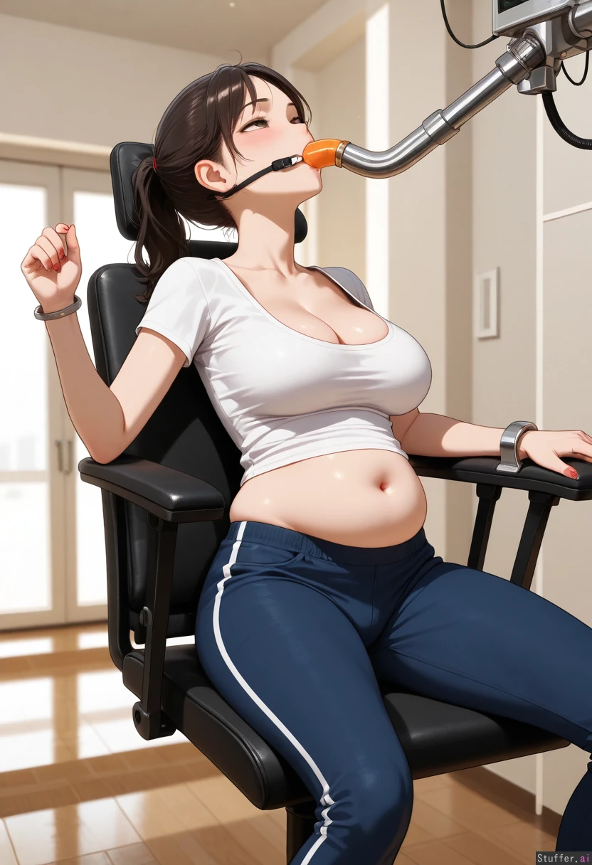 photorealistic 18 year old Asian girl, ( tube fed ), ((fully clothed)). ((bakery surrounded by colorful desserts and food, natural lighting)), embarrassed, ((vacant eyes, squinting, looking up)), ((restrained in comfortable chair, head tilted back))), ((belly ache)), ((feeding tube in mouth, drinking from tube, giant feeding machine)), Solo Asian, ponytail, brown eyes, red nails, deep cleavage, shallow navel, skintight t-shirt, belly hanging over panties, (Petite_body:1.6) Thick, heavy breasts, (Stuffed: 1.5), (Engorged : 1.6), (Taut bloated belly: 1.0), (Bloated belly: 1.5), (Round hips: 1.5), (Narrow_hips: 1.5), (Love handles: 1.5), (Thin arms: 1.5), beautiful shading, highly detailed, best quality, perfect anatomy, perfect proportions, perfect lighting, (best quality), (high rating), absurd res, high res, detailed, ultra quality, ((high quality)), masterpiece, (ultra high resolution), anime eyes, stunning beauty, detailed face, intricate detail, sophisticated detail, 1girl, exquisite detail, absurd resolution, correct anatomy, 8k, (highly detailed face), highly detailed skin texture,