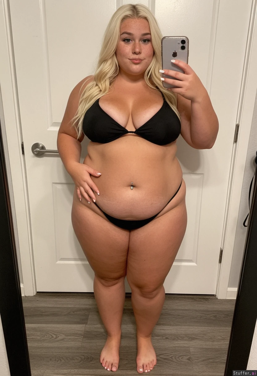 A sexy 21 yo tan (beautiful model girl face) platinum blonde with long wavy hair and freckles , wearing a black bikini, standing taking a selfie, barefoot toes painted white. Full body view She is a shortstack , pear-shaped_figure , (wide soft hips) (huge thick thighs) (bottom heavy) (tan) (belly button piercing) (nose ring) (soft) (morbidly obese) (Stretch marks) (fat legs) (cankles) (cellulite) (BBW) (soft flabby belly) Realistic, best_quality , real_life