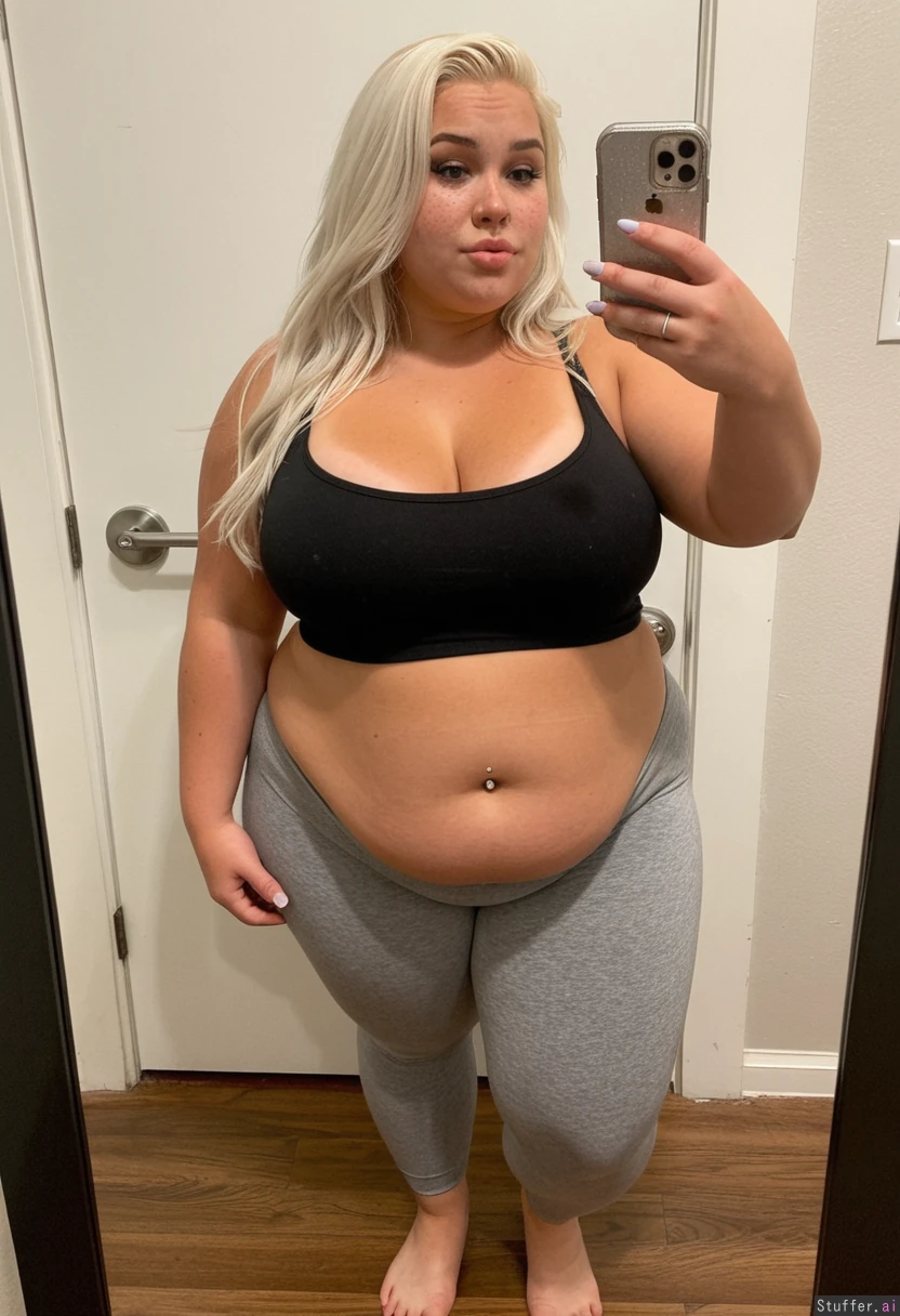 A sexy hyper obese 21 yo tan (beautiful model girl face) platinum blonde with long wavy hair and freckles , wearing a black crop top and grey leggings, standing taking a selfie, barefoot toes painted white. Full body view She is a shortstack , pear-shaped_figure , (wide soft hips) (huge thick thighs) (bottom heavy) (tan) (belly button piercing) (nose ring) (soft) (hyper obese) (Stretch marks) (fat legs) (cankles) (cellulite) (USSBBW) (soft flabby belly) (enormously fat) Realistic, best_quality , real_life