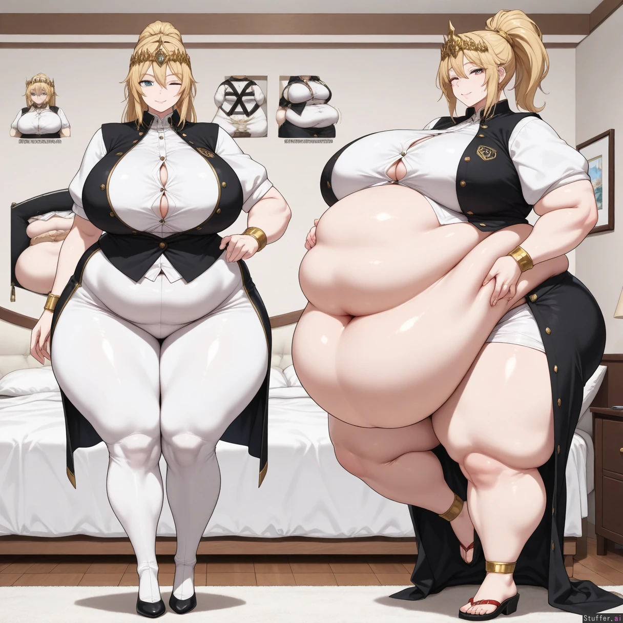 majestic graceful queen of the night zenobia,(blond high ponytail 3.0) brigth emerald eyes, Thin_eyes, narrow eyes,((( pale skin))), larger_female,bright expression(High quality, ultra high definition, 8k, masterpiece, perfect hands and fingers, (((perfect clear eyes))), incredible shading and lighting),big lavish crown jewels all over her body, bellyheavy, exquisite lighting, full body, ((low hanging massive belly)) , (((, hyper plump, morbidly obese,fat arms,belly_rolls,fat_rolls ))), (((tall))), adult, (((rubbing belly))),beautiful,(((smart look))) ((fat legs,thick fat, massive double belly)),(((has a flabby_waist with deep fat_rolls_))) //Action// ((( weight gain progression from slim to chubby to fat to massiv ,front view panel, side view panel,comparison ))),(((rubbing belly))),(((raised_leg))) ,(((wink))),(button gaps), (several buttons), (buttons straining), (too tight), (too fat), (belly spilling through the gaps), (fully dressed), (fully buttoned), (covered belly)),((( green and white Patternt ranger outfit))) Background; (((japanese bedroom )))