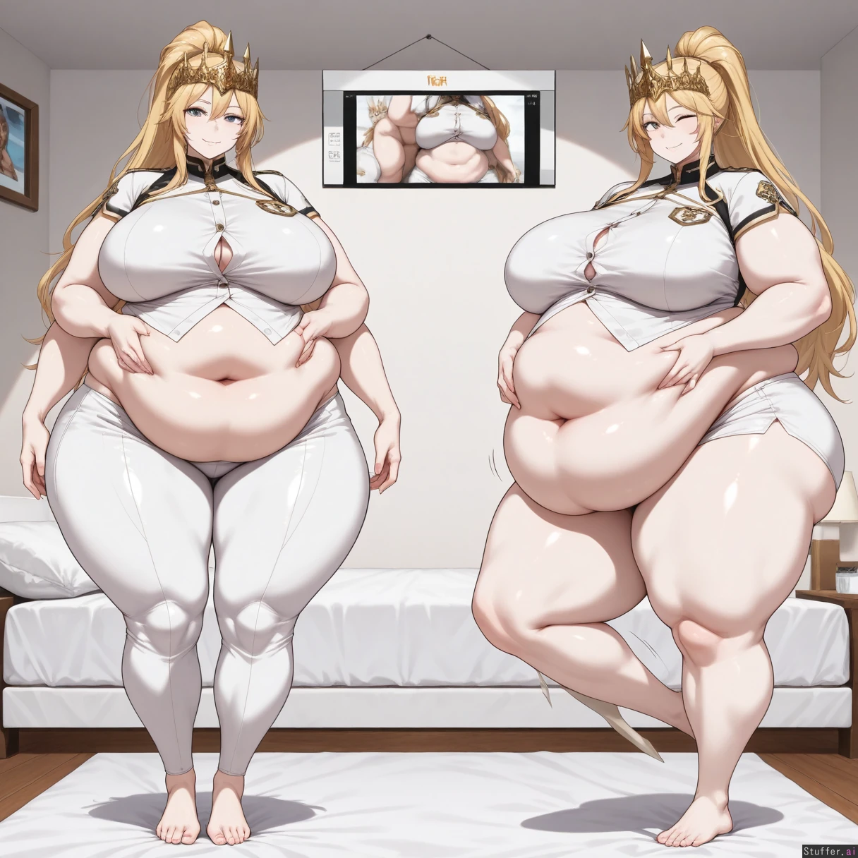 majestic graceful queen of the night zenobia,(blond high ponytail 3.0) brigth emerald eyes, Thin_eyes, narrow eyes,((( pale skin))), larger_female,bright expression(High quality, ultra high definition, 8k, masterpiece, perfect hands and fingers, (((perfect clear eyes))), incredible shading and lighting),big lavish crown jewels all over her body, bellyheavy, exquisite lighting, full body, ((low hanging massive belly)) , (((, hyper plump, morbidly obese,fat arms,belly_rolls,fat_rolls ))), (((tall))), adult, (((rubbing belly))),beautiful,(((smart look))) ((fat legs,thick fat, massive double belly)),(((has a flabby_waist with deep fat_rolls_))) //Action// ((( weight gain progression from slim to chubby to fat to massiv ,front view panel, side view panel,comparison ))),(((rubbing belly))),(((raised_leg))) ,(((wink))),(button gaps), (several buttons), (buttons straining), (too tight), (too fat), (belly spilling through the gaps), (fully dressed), (fully buttoned), (covered belly)),((( green and white Patternt ranger outfit))) Background; (((japanese bedroom )))