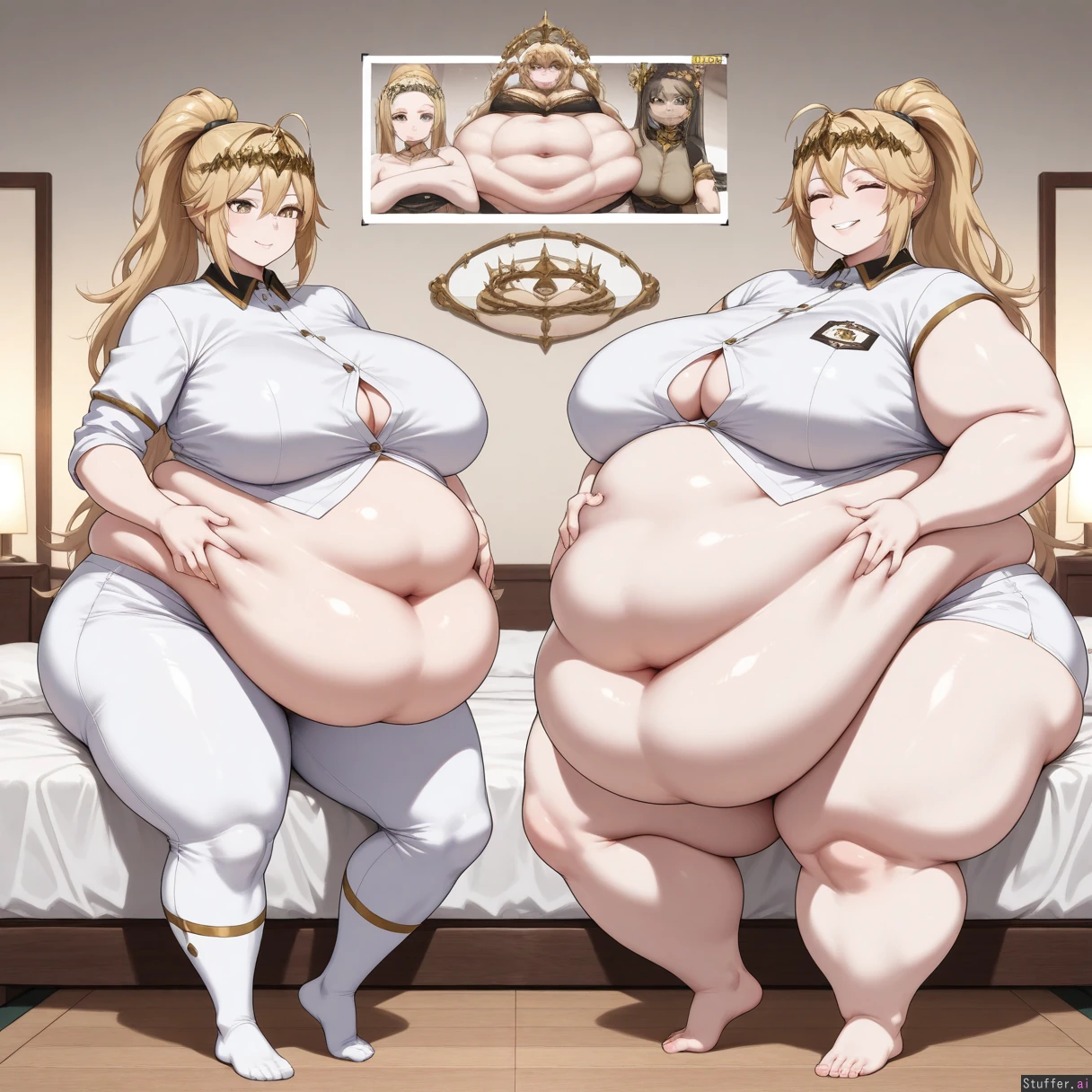 majestic graceful queen of the night zenobia,(blond high ponytail 3.0) brigth emerald eyes, Thin_eyes, narrow eyes,((( pale skin))), larger_female,bright expression(High quality, ultra high definition, 8k, masterpiece, perfect hands and fingers, (((perfect clear eyes))), incredible shading and lighting),big lavish crown jewels all over her body, bellyheavy, exquisite lighting, full body, ((low hanging massive belly)) , (((, hyper plump, morbidly obese,fat arms,belly_rolls,fat_rolls ))), (((tall))), adult, (((rubbing belly))),beautiful,(((smart look))) ((fat legs,thick fat, massive double belly)),(((has a flabby_waist with deep fat_rolls_))) //Action// ((( weight gain progression from slim to chubby to fat to massiv ,front view panel, side view panel,comparison ))),(((rubbing belly))),(((raised_leg))) ,(((wink))),(button gaps), (several buttons), (buttons straining), (too tight), (too fat), (belly spilling through the gaps), (fully dressed), (fully buttoned), (covered belly)),((( green and white Patternt ranger outfit))) Background; (((japanese bedroom )))