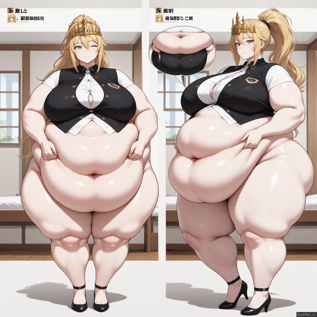 majestic graceful queen of the night zenobia,(blond high ponytail 3.0) brigth emerald eyes, Thin_eyes, narrow eyes,((( pale skin))), larger_female,bright expression(High quality, ultra high definition, 8k, masterpiece, perfect hands and fingers, (((perfect clear eyes))), incredible shading and lighting),big lavish crown jewels all over her body, bellyheavy, exquisite lighting, full body, ((low hanging massive belly)) , (((, hyper plump, morbidly obese,fat arms,belly_rolls,fat_rolls ))), (((tall))), adult, (((rubbing belly))),beautiful,(((smart look))) ((fat legs,thick fat, massive double belly)),(((has a flabby_waist with deep fat_rolls_))) //Action// ((( weight gain progression from slim to chubby to fat to massiv ,front view panel, side view panel,comparison ))),(((rubbing belly))),(((raised_leg))) ,(((wink))),(button gaps), (several buttons), (buttons straining), (too tight), (too fat), (belly spilling through the gaps), (fully dressed), (fully buttoned), (covered belly)),((( green and white Patternt ranger outfit))) Background; (((japanese bedroom )))