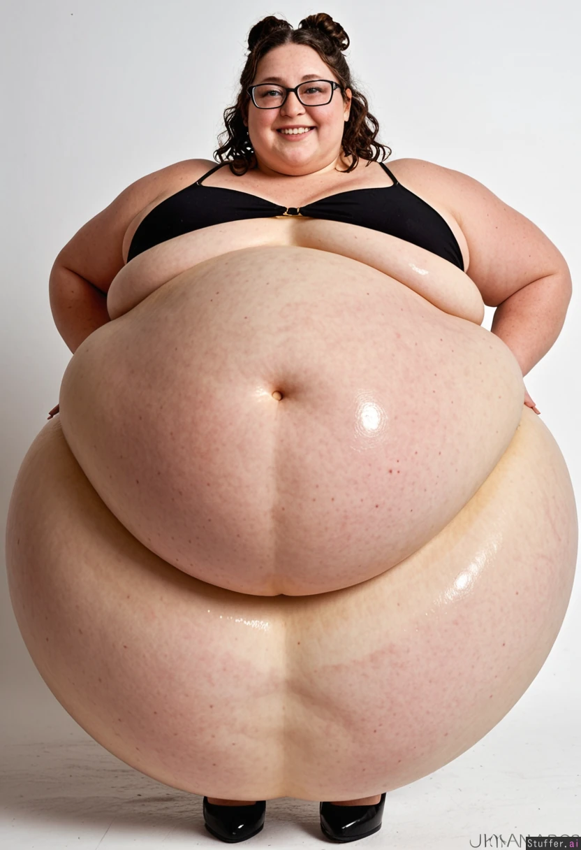 (Huge fat hyper obese) woman with a (huge hyper obese belly:2.7) smiling black curly hair in a bun glasses wearing high heels standing