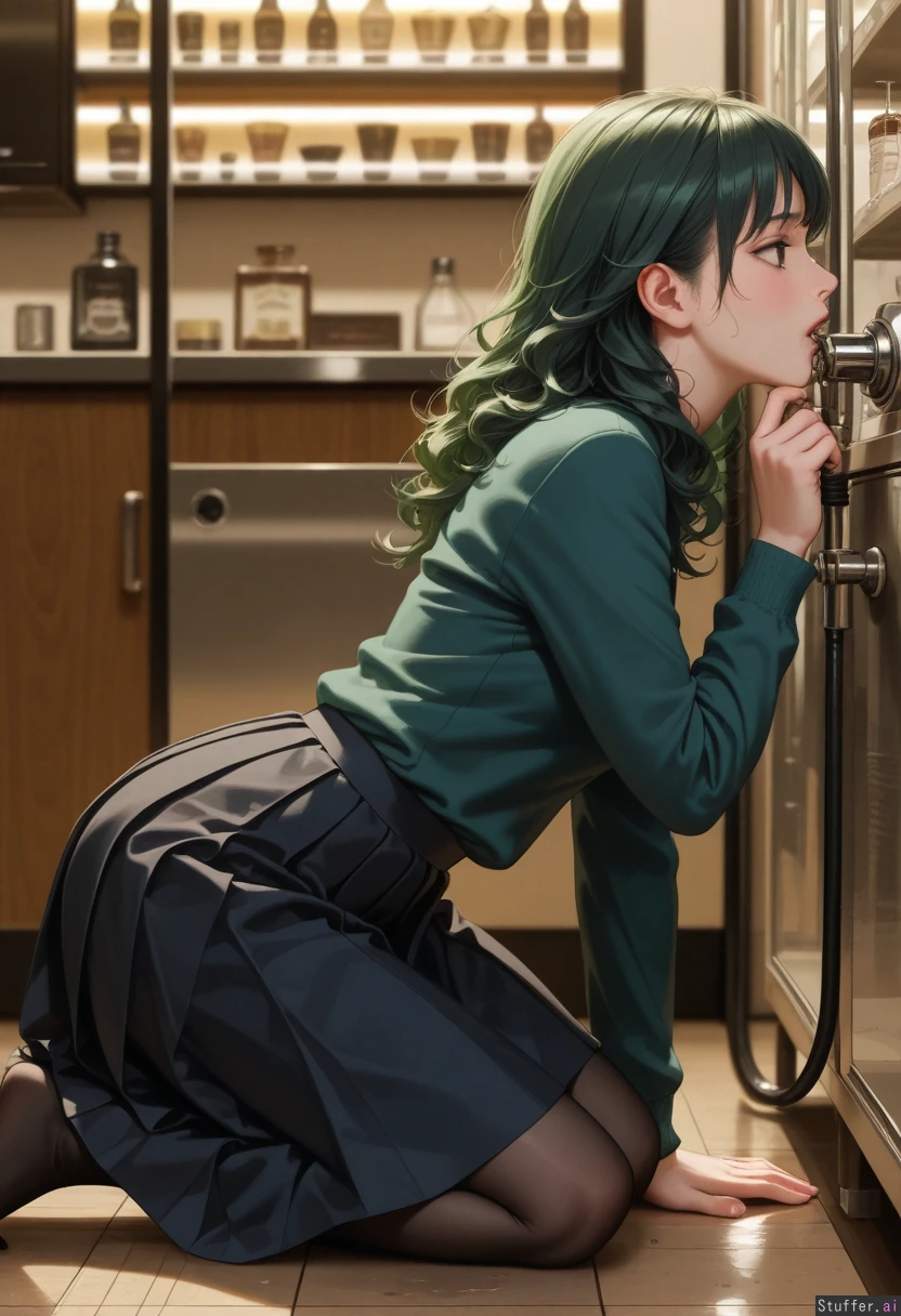(masterpiece, best quality, realistic, detailed lighting), 1girl, solo, right-facing side profile, kneeling on the floor, camera on her left side, machine on the right side of the image, fixed side view, no mirrored composition, cozy ice cream shop interior, large stainless steel soft serve machine, visible metal nozzle, dark green curly hair with bangs, wide brown eyes, square face, slightly soft lower belly, minimal love handles, slightly wider hips, more chocolate on chin, thin drips down neck, tiny puddle on floor, upper body still slim, dark green sweater tucked into black pleated skirt, black tights, leaning forward, mouth sealed around the machine nozzle, liquid chocolate flowing directly from the tap into her mouth, right hand pulling the lever, left hand resting on her lower belly, primary focus on nozzle-to-mouth contact, shallow depth of field