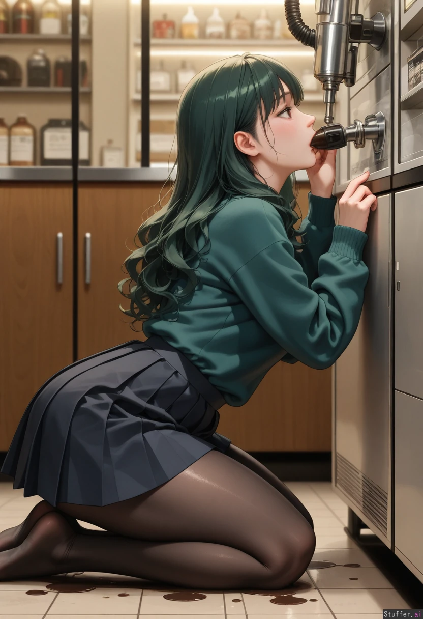 (masterpiece, best quality, realistic, detailed lighting), 1girl, solo, right-facing side profile, kneeling on the floor, camera on her left side, machine on the right side of the image, fixed side view, no mirrored composition, cozy ice cream shop interior, large stainless steel soft serve machine, visible metal nozzle, dark green curly hair with bangs, wide brown eyes, square face, large lower belly hanging heavily, wide love handles, very thick thighs, bigger soft butt, face messy with chocolate, thick streams down sweater and thighs, puddle growing, chest remains small, dark green sweater tucked into black pleated skirt, black tights, leaning forward, mouth sealed around the machine nozzle, liquid chocolate flowing directly from the tap into her mouth, right hand pulling the lever, left hand resting on her lower belly, primary focus on nozzle-to-mouth contact, shallow depth of field