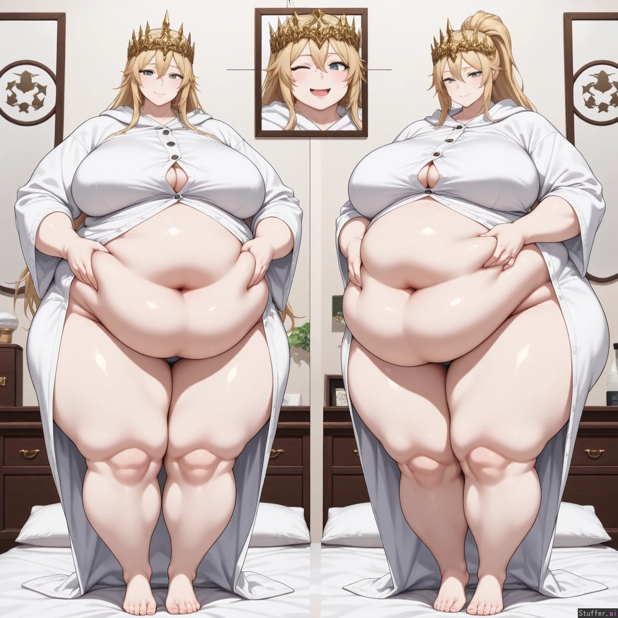 majestic graceful queen of the night zenobia,(blond high ponytail 3.0) brigth emerald eyes, Thin_eyes, narrow eyes,((( pale skin))), larger_female,bright expression(High quality, ultra high definition, 8k, masterpiece, perfect hands and fingers, (((perfect clear eyes))), incredible shading and lighting),big lavish crown jewels all over her body, bellyheavy, exquisite lighting, full body, ((low hanging massive belly)) , (((, hyper plump, morbidly obese,fat arms,belly_rolls,fat_rolls ))), (((tall))), adult, (((rubbing belly))),beautiful,(((smart look))) ((fat legs,thick fat, massive double belly)),(((has a flabby_waist with deep fat_rolls_))) //Action// ((( weight gain progression from slim to chubby to fat to massiv ,front view panel, side view panel,comparison ))),(((rubbing belly))),(((raised_leg))) ,(((wink))),(button gaps), (several buttons), (buttons straining), (too tight), (too fat), (belly spilling through the gaps), (fully dressed), (fully buttoned), (covered belly)),((( green and white Patternt robe,))) Background; (((japanese bedroom )))