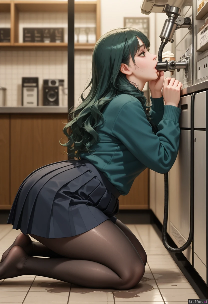(masterpiece, best quality, realistic, detailed lighting), 1girl, solo, right-facing side profile, kneeling on the floor, camera on her left side, machine on the right side of the image, fixed side view, no mirrored composition, cozy ice cream shop interior, large stainless steel soft serve machine, visible metal nozzle, dark green curly hair with bangs, wide brown eyes, square face, enormous lower belly under navel, heavy love handles, extremely thick thighs, very soft round butt, face heavily coated, chocolate drips down chin, neck, sweater, puddle expanding, upper torso still slim, dark green sweater tucked into black pleated skirt, black tights, leaning forward, mouth sealed around the machine nozzle, liquid chocolate flowing directly from the tap into her mouth, right hand pulling the lever, left hand resting on her lower belly, primary focus on nozzle-to-mouth contact, shallow depth of field