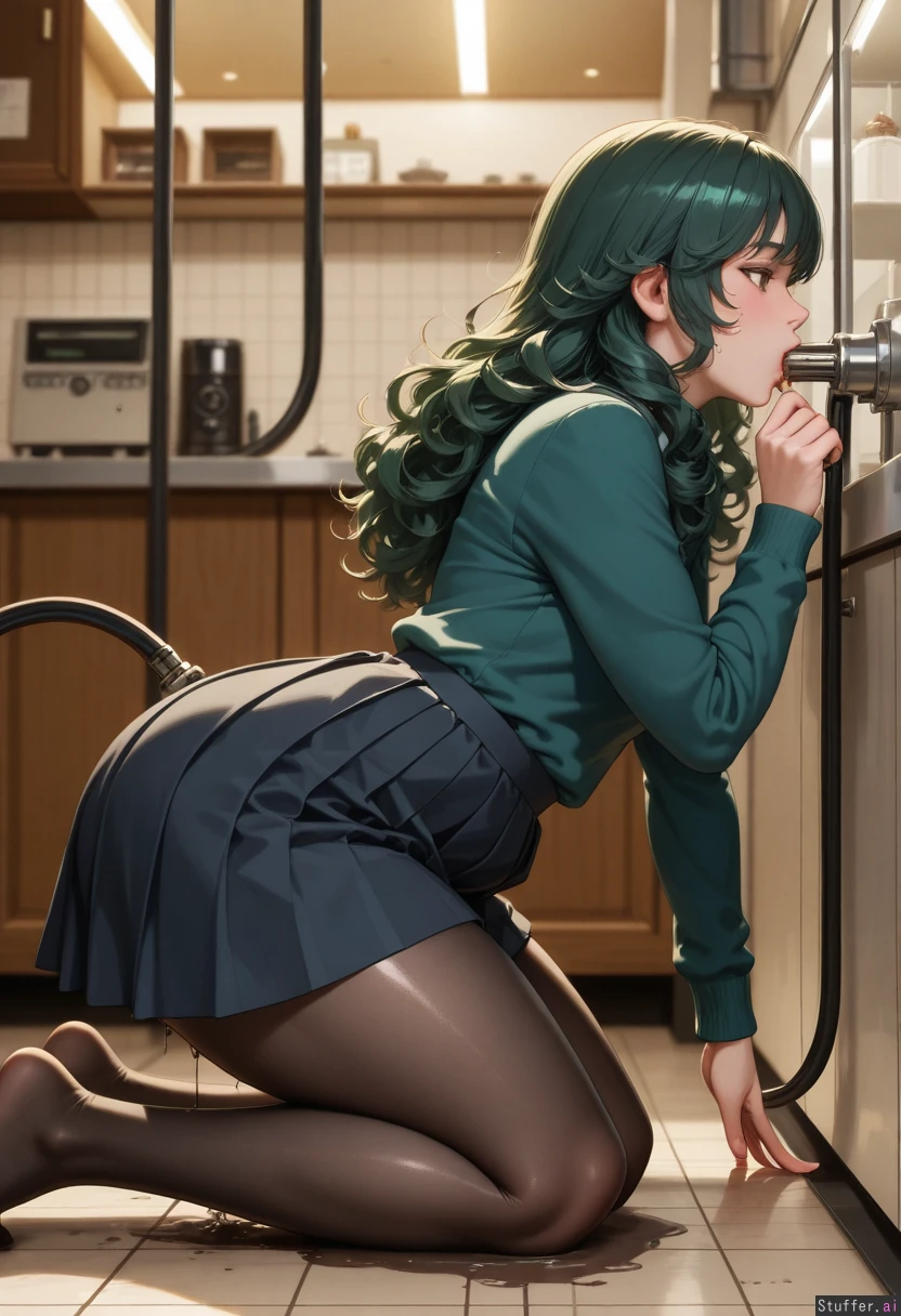 (masterpiece, best quality, realistic, detailed lighting), 1girl, solo, right-facing side profile, kneeling on the floor, camera on her left side, machine on the right side of the image, fixed side view, no mirrored composition, cozy ice cream shop interior, large stainless steel soft serve machine, visible metal nozzle, dark green curly hair with bangs, wide brown eyes, square face, massive soft lower belly, pronounced love handles, extremely wide hips, very thick thighs, huge soft butt, chocolate covering lower face, long streams dripping on sweater and thighs, puddle growing, chest small, dark green sweater tucked into black pleated skirt, black tights, leaning forward, mouth sealed around the machine nozzle, liquid chocolate flowing directly from the tap into her mouth, right hand pulling the lever, left hand resting on her lower belly, primary focus on nozzle-to-mouth contact, shallow depth of field