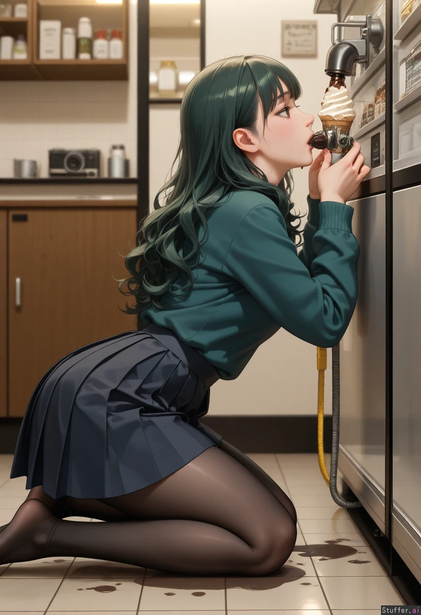 (masterpiece, best quality, realistic, detailed lighting), 1girl, solo, right-facing side profile, kneeling on the floor, camera on her left side, machine on the right side of the image, fixed side view, no mirrored composition, cozy ice cream shop interior, large stainless steel soft serve machine, visible metal nozzle, dark green curly hair with bangs, wide brown eyes, square face, very large heavily hanging lower belly, extreme love handles, extremely thick soft thighs, massive soft butt, chocolate coated across chin, jaw, neck, sweater, very large puddle on floor, upper torso slim, dark green sweater tucked into black pleated skirt, black tights, leaning forward, mouth sealed around the machine nozzle, liquid chocolate flowing directly from the tap into her mouth, right hand pulling the lever, left hand resting on her lower belly, primary focus on nozzle-to-mouth contact, shallow depth of field
