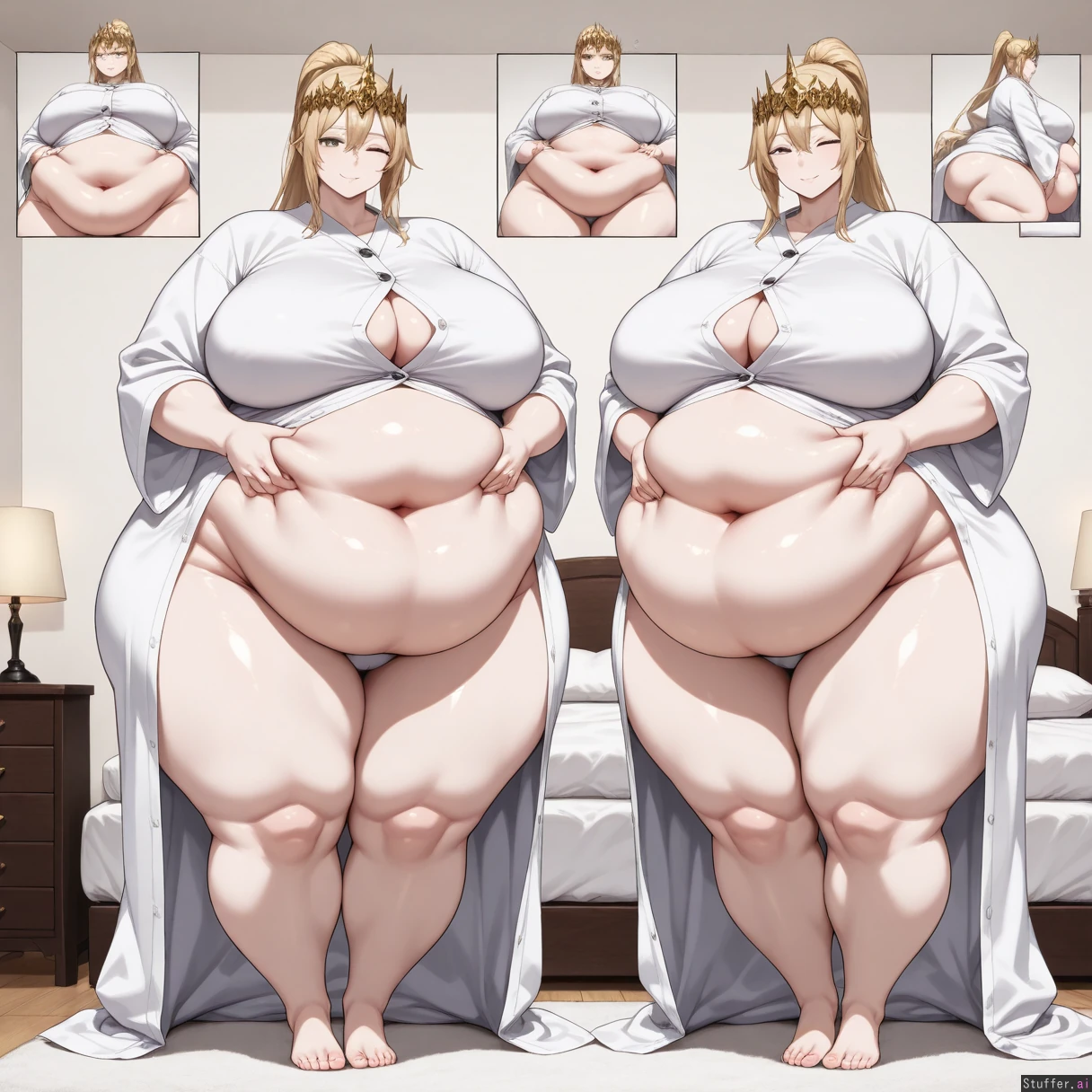 majestic graceful queen of the night zenobia,(blond high ponytail 3.0) brigth emerald eyes, Thin_eyes, narrow eyes,((( pale skin))), larger_female,bright expression(High quality, ultra high definition, 8k, masterpiece, perfect hands and fingers, (((perfect clear eyes))), incredible shading and lighting),big lavish crown jewels all over her body, bellyheavy, exquisite lighting, full body, ((low hanging massive belly)) , (((, hyper plump, morbidly obese,fat arms,belly_rolls,fat_rolls ))), (((tall))), adult, (((rubbing belly))),beautiful,(((smart look))) ((fat legs,thick fat, massive double belly)),(((has a flabby_waist with deep fat_rolls_))) //Action// ((( weight gain progression from slim to chubby to fat to massiv ,front view panel, side view panel,comparison ))),(((rubbing belly))),(((raised_leg))) ,(((wink))),(button gaps), (several buttons), (buttons straining), (too tight), (too fat), (belly spilling through the gaps), (fully dressed), (fully buttoned), (covered belly)),((( green and white Patternt outdoor robe,))) Background; (((japanese bedroom )))
