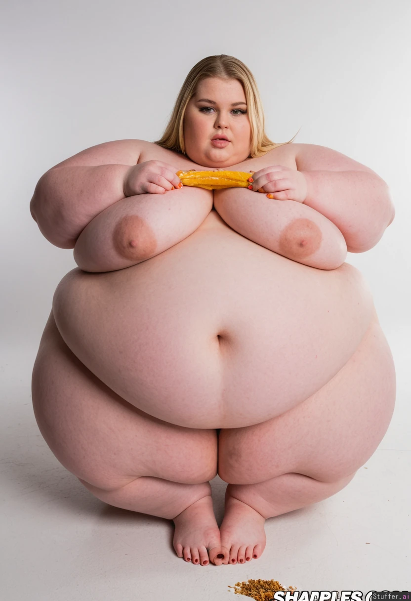 Very beautiful very fat blonde ((model)) in a photographic studio, wearing a once baggy shirt, a massively bloated and swollen huge belly (((((SSBBW shapeless blob body))))) Gorging and stuffing herself with food. Posing for a (((very super sexy feedism fetish photo shoot))). (((Getting more and more stuffed and bloated)). ((Medium long shot full body view)). (((((Getting fatter and fatter))))) (((Back profile body view shot))) (((overhead aerial point of view shot))) (((Lying down flat on the floor legs wide apart))). (((Gasping and sweating with effort)). Food all around.