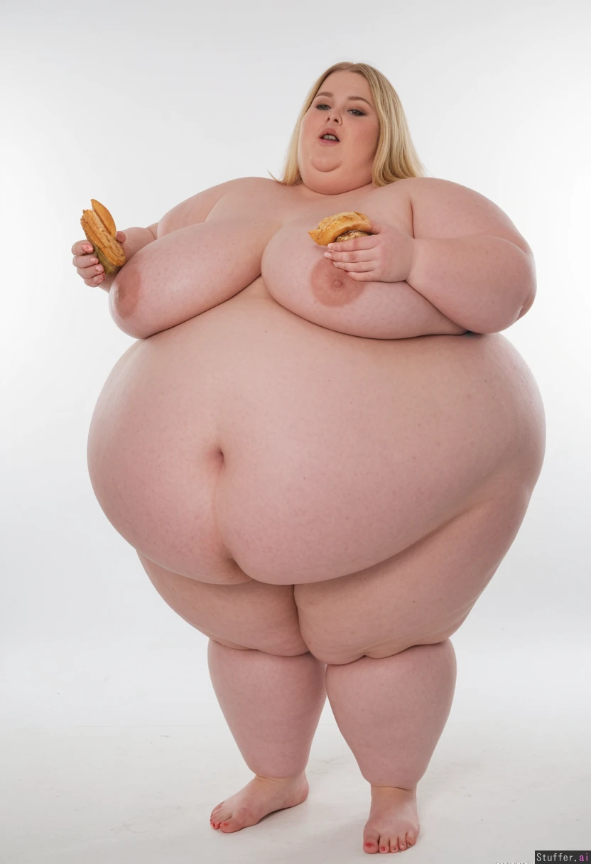 Very beautiful very fat blonde ((model)) in a photographic studio, wearing a once baggy shirt, a massively bloated and swollen huge belly (((((SSBBW shapeless blob body))))) Gorging and stuffing herself with food. Posing for a (((very super sexy feedism fetish photo shoot))). (((Getting more and more stuffed and bloated)). ((Medium long shot full body view)). (((((Getting fatter and fatter))))) ((( Side body view shot))) (((Standing))). (((Gasping and sweating with effort)). Food all around.
