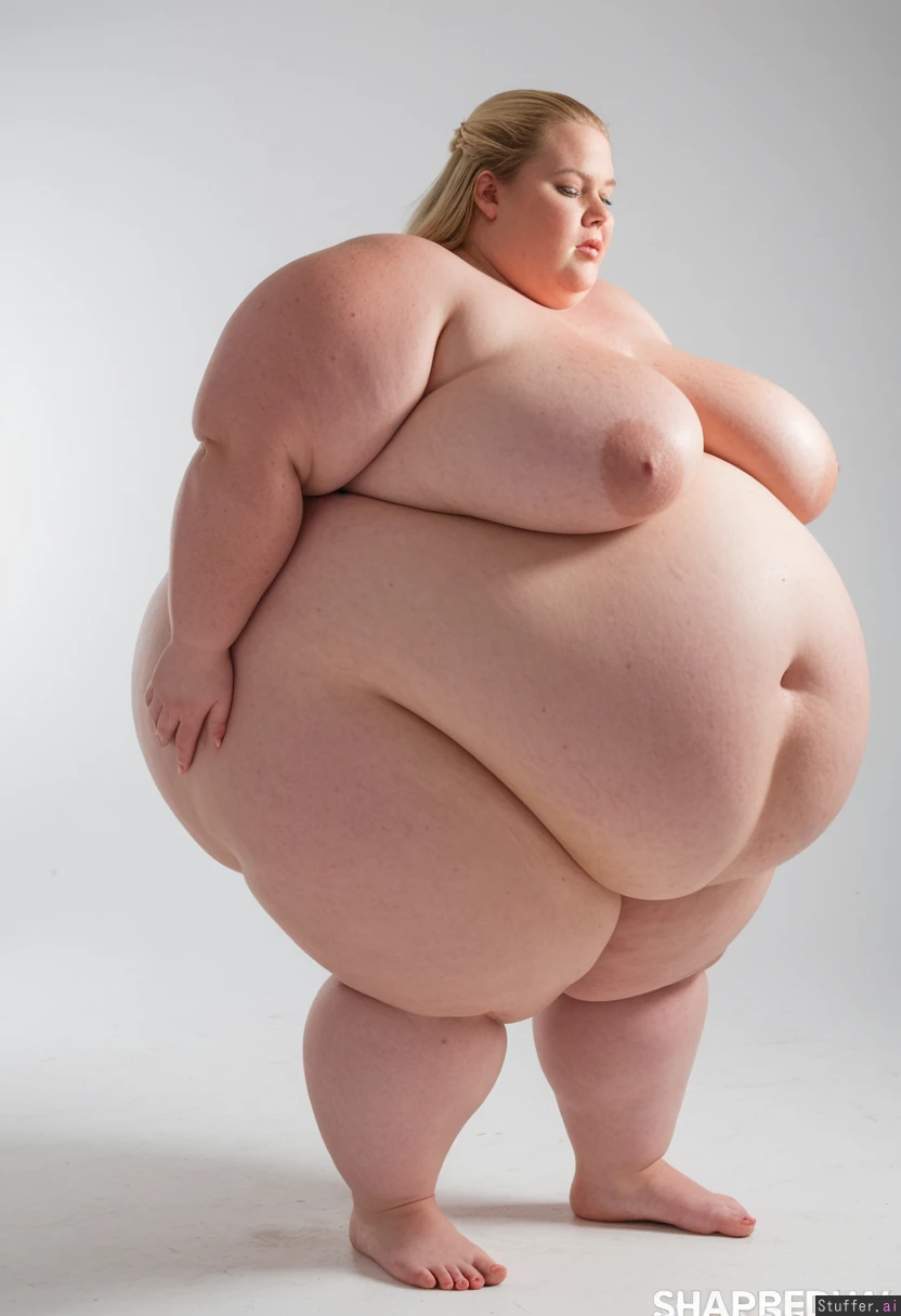 Very beautiful very fat blonde ((model)) in a photographic studio, wearing a once baggy shirt, a massively bloated and swollen huge belly (((((SSBBW shapeless blob body))))) Gorging and stuffing herself with food. Posing for a (((very super sexy feedism fetish photo shoot))). (((Getting more and more stuffed and bloated)). ((Medium long shot full body view)). (((((Getting fatter and fatter))))) ((( side profile body view shot))) (((Standing))). (((Gasping and sweating with effort)). Food all around.