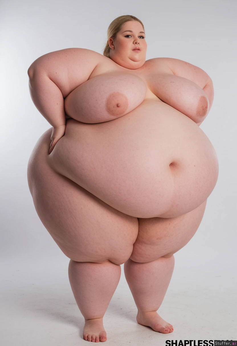 Very beautiful very fat blonde ((model)) in a photographic studio, wearing a once baggy shirt, a massively bloated and swollen huge belly (((((SSBBW shapeless blob body))))) Gorging and stuffing herself with food. Posing for a (((very super sexy feedism fetish photo shoot))). (((Getting more and more stuffed and bloated)). ((Medium long shot full body view)). (((((Getting fatter and fatter))))) ((( Back profile body view shot))) (((Standing))). (((Gasping and sweating with effort)). Food all around.