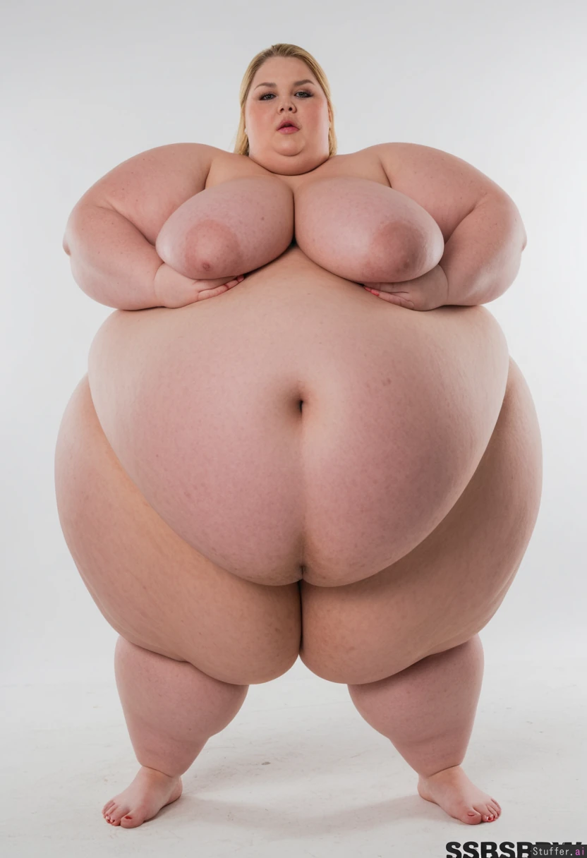 Very beautiful very fat blonde ((model)) in a photographic studio, wearing a once baggy shirt, a massively bloated and swollen huge belly (((((SSBBW shapeless blob body))))) Gorging and stuffing herself with food. Posing for a (((very super sexy feedism fetish photo shoot))). (((Getting more and more stuffed and bloated)). ((Medium long shot full body view)). (((((Getting fatter and fatter))))) ((( Back profile body view shot))) (((Standing))). (((Gasping and sweating with effort)). Food all around.