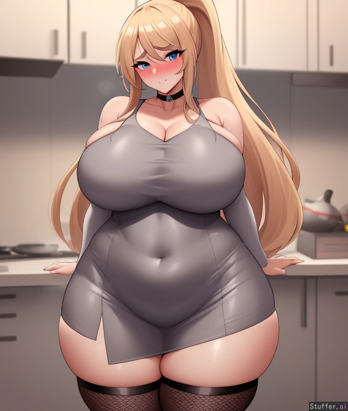 Dark blonde, gorgeous female, ponytail, model, fishnets, choker, thighhighs, blushing flirty shy, serena_(pokemon)_(cosplay), spoilt brat, skinny, attractive, big hip to waist ratio, stunning eyes, kind, fit, (wearing a grey tight dress), (looking_at_viewer), (best quality), masterpiece, best quality, score_7., dark blonde hair, thin, (thin thighs), (high face detail), ((huge wide giant veiny round big overspilling breasts)), high detail gorgeous big blue eyes, pretty face, head tilt, (4K hd quality), expressive eyebrows, blushing a lot, skinny chubby fat, (lots of boob overspill), breast bigger than head, (very wide curvy), (sexy detail), In kitchen,
