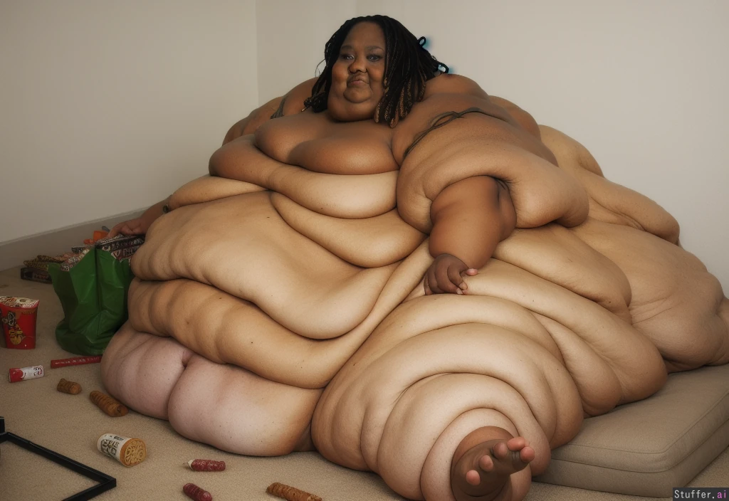 masterpiece, best quality, score_7. Photo realistic, ultra high quality, african ssbbw, extremely fat blob, beautiful face:1.4, (ultra double chin:1.9), (ultra fat face:1.9), ultra huge legs:1.9), (ultra huge arms:1.9), black braided hair:1.4 sitting on the floor, surrounded by junk food