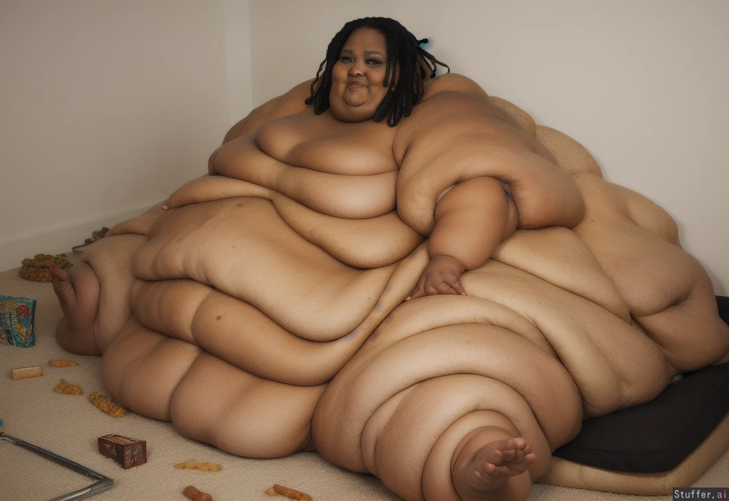 masterpiece, best quality, score_7. Photo realistic, ultra high quality, african ssbbw, extremely fat blob, beautiful face:1.4, (ultra double chin:1.9), (ultra fat face:1.9), ultra huge legs:1.9), (ultra huge arms:1.9), black braided hair:1.4 sitting on the floor, surrounded by junk food