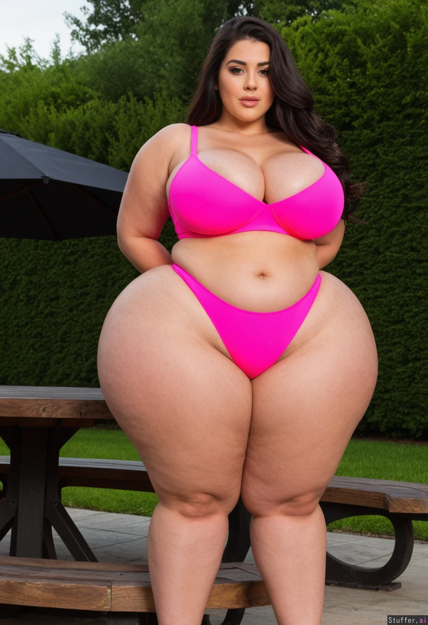 Very realistic, high definition, very detailed 25 year old woman standing on top of picnic table outside Tan skin Bright lighting Wearing ultra hot pink thong Wearing hot pink crop top (((((Enormous hyper massive curvy filled out longest hips))))) (((((Widest thick oversized mega wide hips))))) (((((Enormous massive rotund full oversized long cleavage)))))