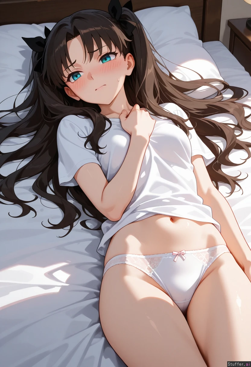 tohsaka_rin, solo, In bed, morning, White t-shirt, white panties, Horny, blushing, casting a spell,