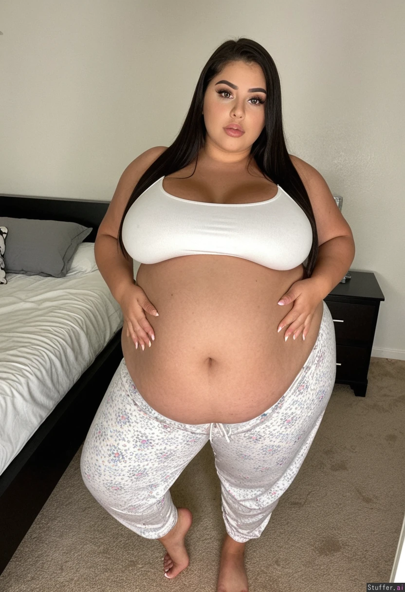 Style: selfie from girlfriend Subject: 21 year old, latina girl. Face: Very beautiful, gorgeous face, grey eyes, eyelashes, lip gloss, smooth skin. Hair: Dark hair, straight hairstyle, medium length. Body: (Chubby belly), (huge belly), (massive belly), (thick thighs), (wide waist), large breasts, white nails, obese, (very swollen belly), Clothes: (She's wearing tight top and pijama pants), barefoot Action: Posing, gaining weight, Localisation: In bedroom
