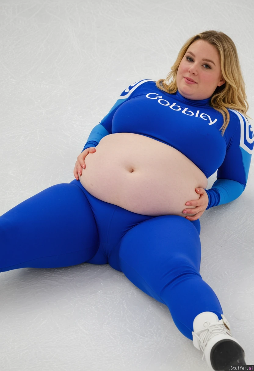 A beautiful blonde olympic ice skate racer. Wearing a tight blue speed suit. (laying on the ice) (thin shoulders) ((glutton)) (big potbelly: 1.4) ((round belly)) ((fully clothed)), (fat belly), (chubby:0.5) ((curvy hips)) (winter olympics)