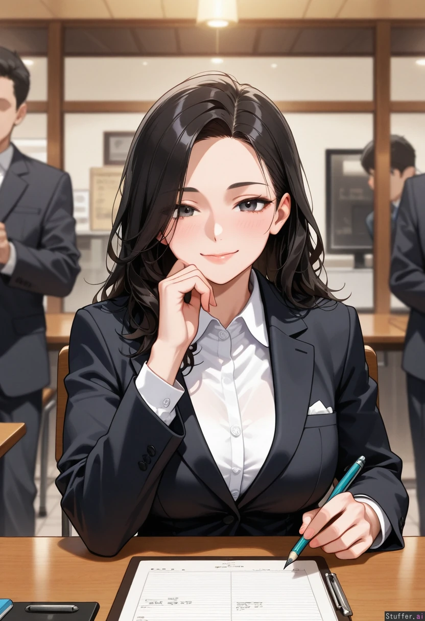 Bbw, middle heavy, long messy black hair, caring smile, wearing a black suit with a white shirt, holding a clipboard and pencil, sitting at a restaurant manager desk