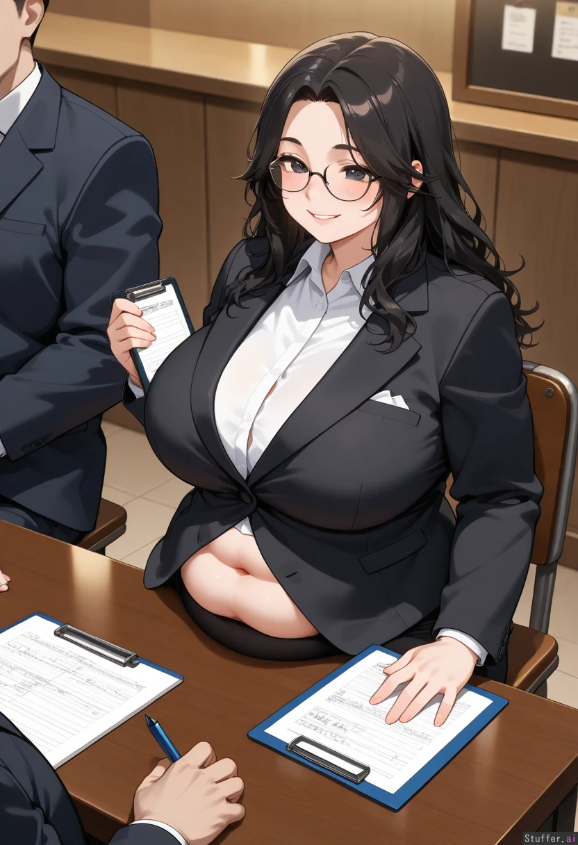 Bbw, middle heavy, long messy black hair, caring smile, wearing a black suit with a white shirt, holding a clipboard and pencil, sitting at a restaurant manager desk, fat belly pressing against desk, 1 person