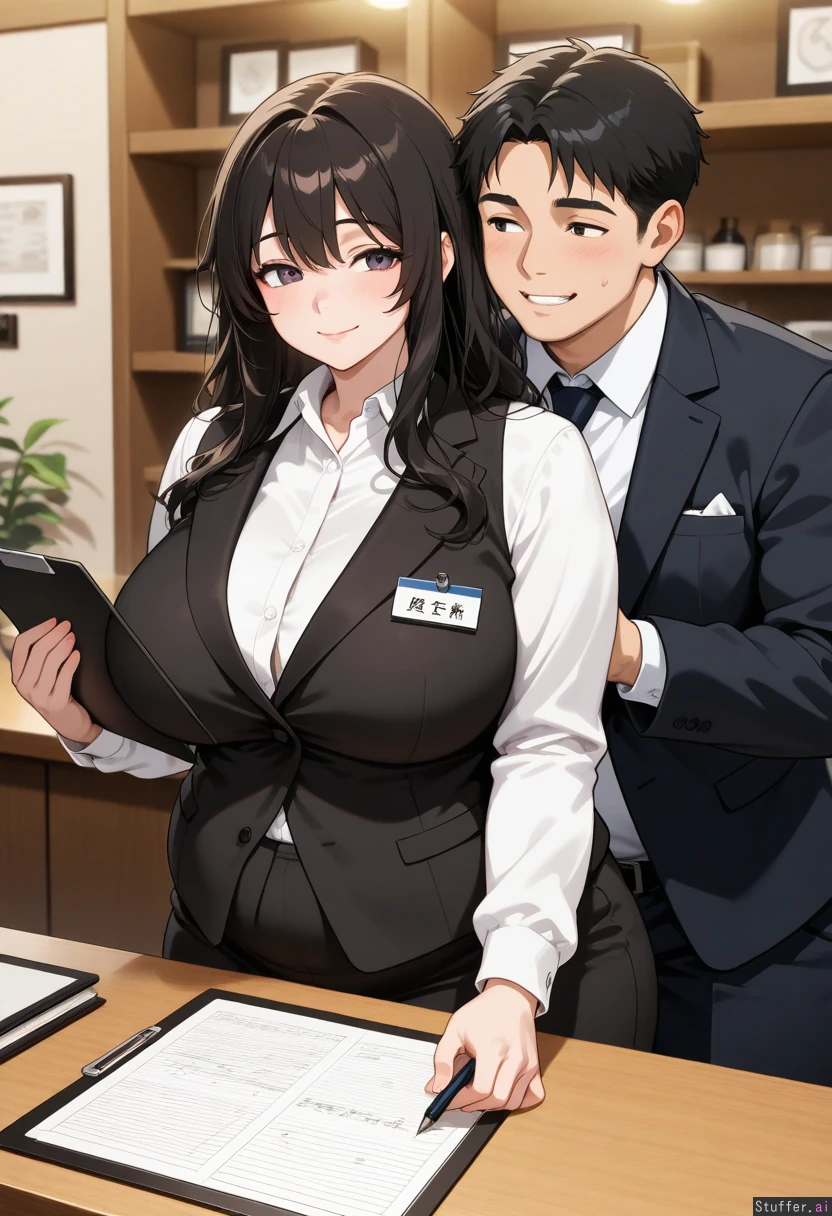 Bbw, middle heavy, long messy black hair, caring smile, wearing a black suit with a white shirt, holding a clipboard and pencil, standing behind restaurant counter, next to fat restaurant coworkers, fat belly pressing against desk, 1 person